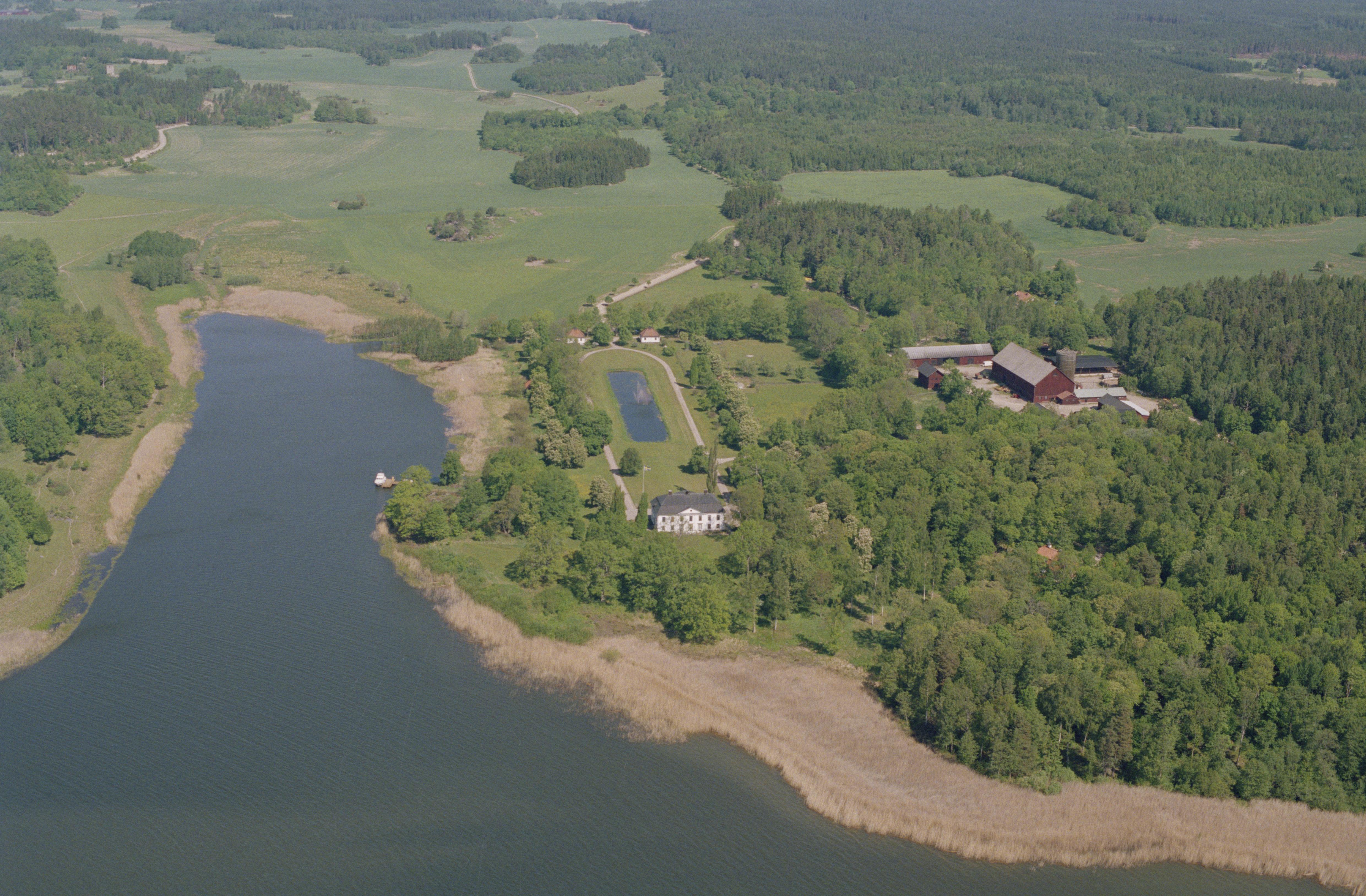 Beskrivning: Vikhus herrgård i storgårdstomt RAÄnr Rytterne 222 vid Vikhusviken i fjärden Lilla Blacken, Mälaren. Bilden är tagen mot (väderstreck): N