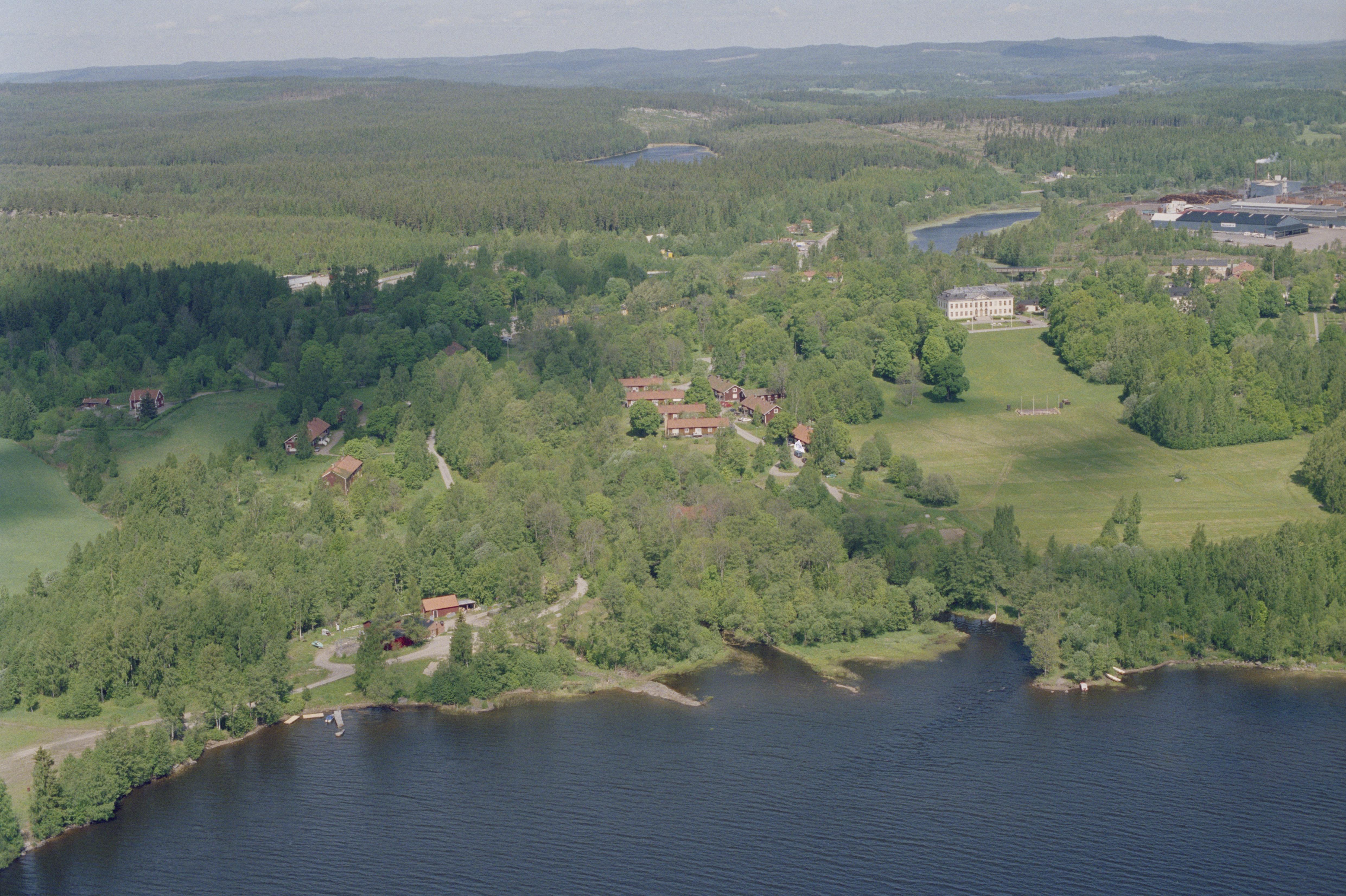 Beskrivning: Skinnskattebergs bruk och tätort. Sjön Nedre Vättern i bildens nedre del. Till höger över bildens mitt byggnadsminnet Skinnskattebergs herrgård. Till vänster om bildens mitt hammarområde RAÄnr Skinnskatteberg 43:1. Bilden är tagen mot (väderstreck): NNV