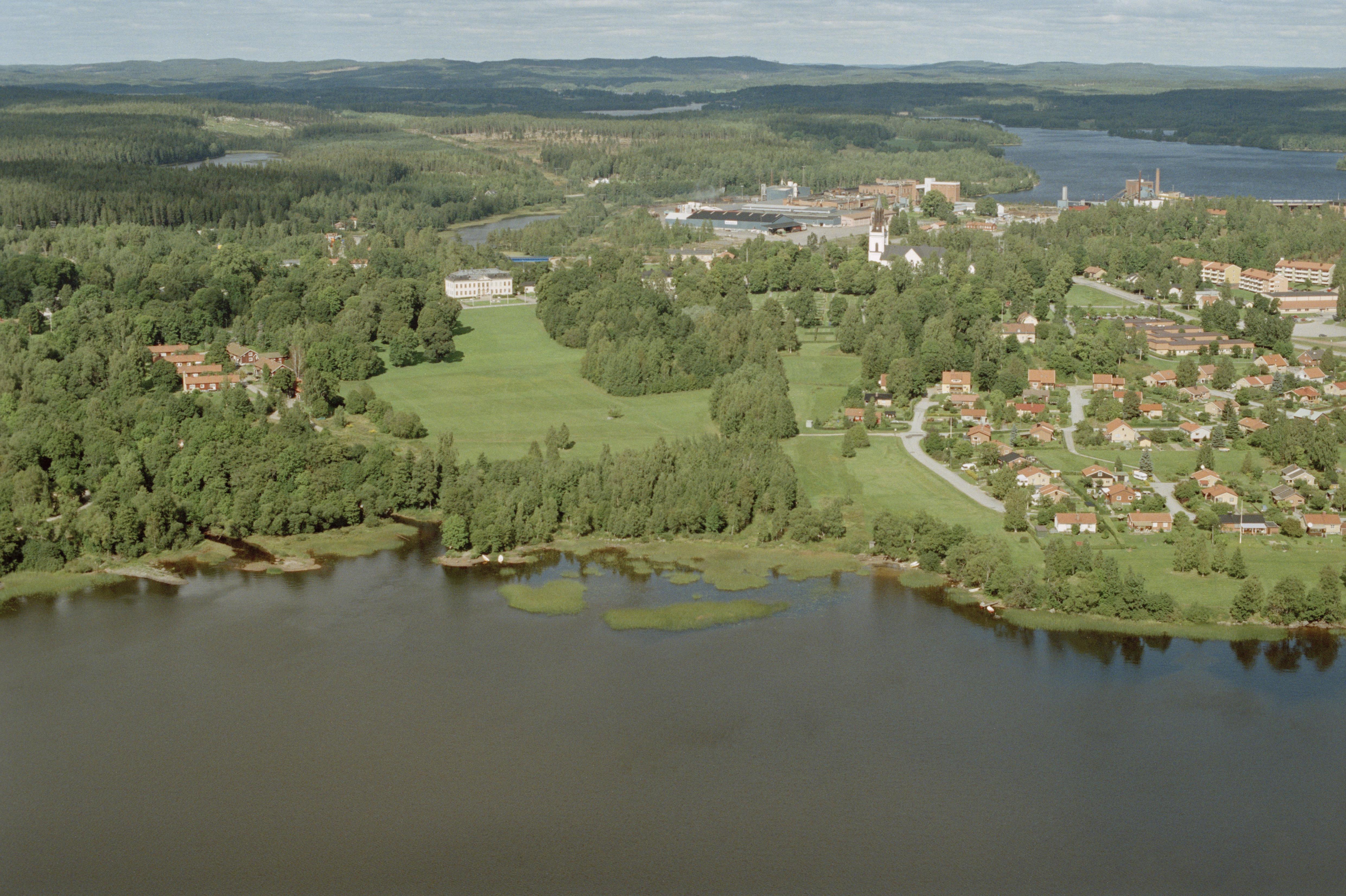 Beskrivning: Skinnskattebergs bruk och tätort mellan sjöarna Övre Vättern och Nedre Vättern. Till vänster över bildens mitt byggnadsminnet Skinnskattebergs herrgård och till höger Skinnskattebergs kyrka. Till vänster om bildens mitt hammarområde RAÄnr Skinnskatteberg 43:1. Bilden är tagen mot (väderstreck): NNV