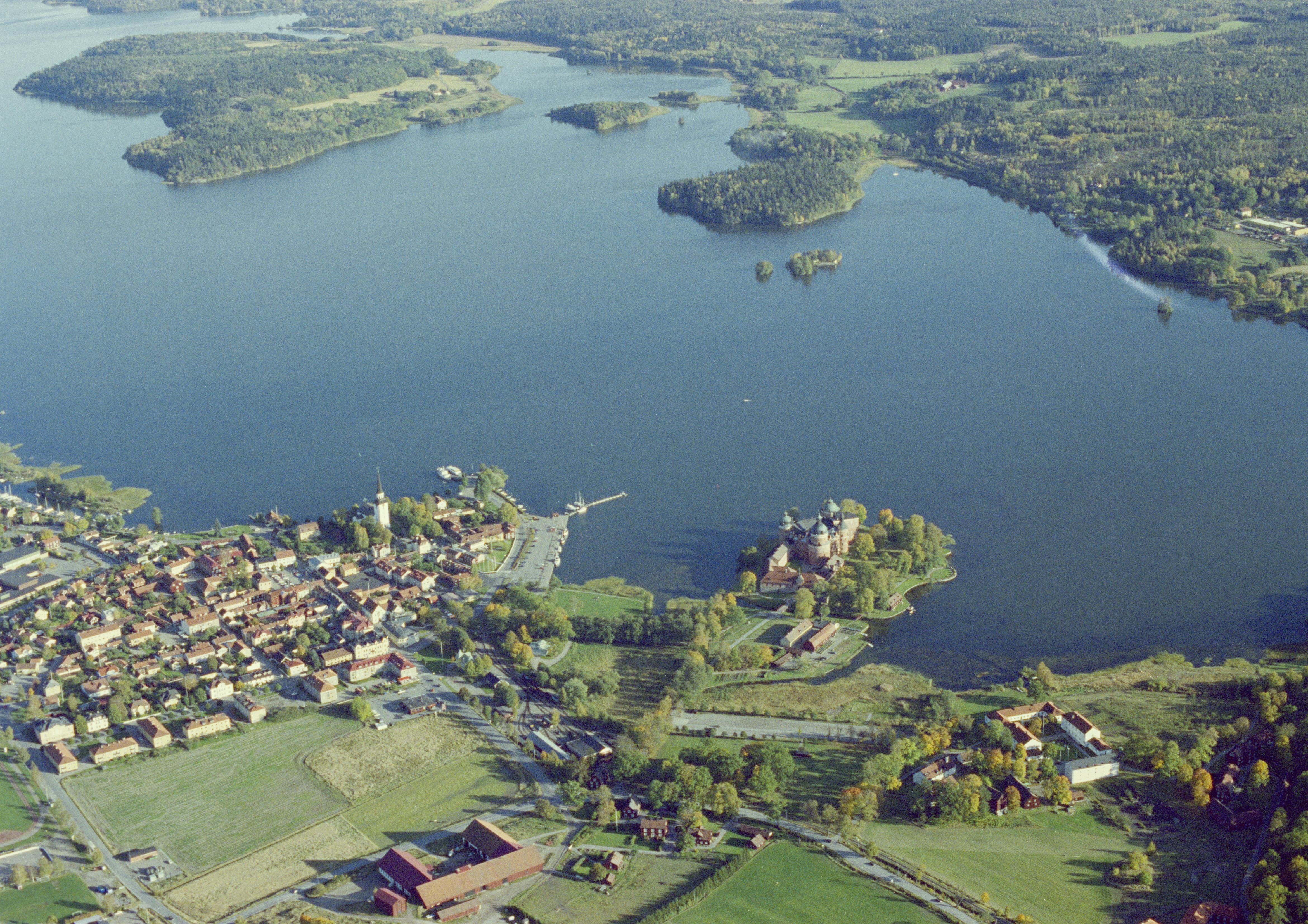 Beskrivning: Mariefreds stad vid gränsen till Kärnbo socken (i bildens högra del). Vid bildens mitt Gripsholms slott och Kungsladugården (i Kärnbo socken). Bilden är tagen mot (väderstreck): Ö