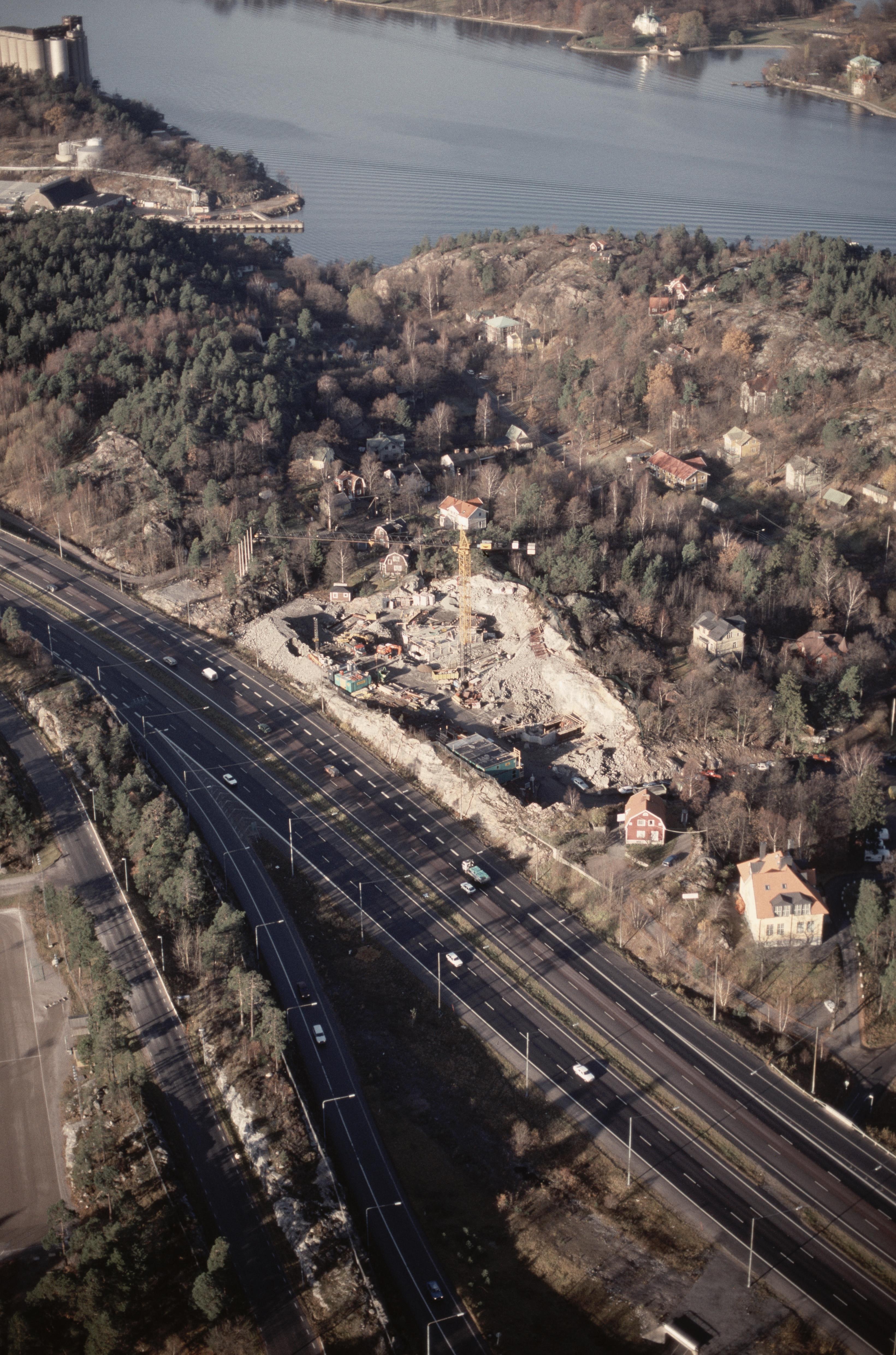 Beskrivning: Sicklaön. Byggplats i Vikdalen vid Nacka centrum. I bildens övre del Kvarnholmen och farleden Saltsjön vid Djurgården i Stockholm. Bilden är tagen mot (väderstreck): NV