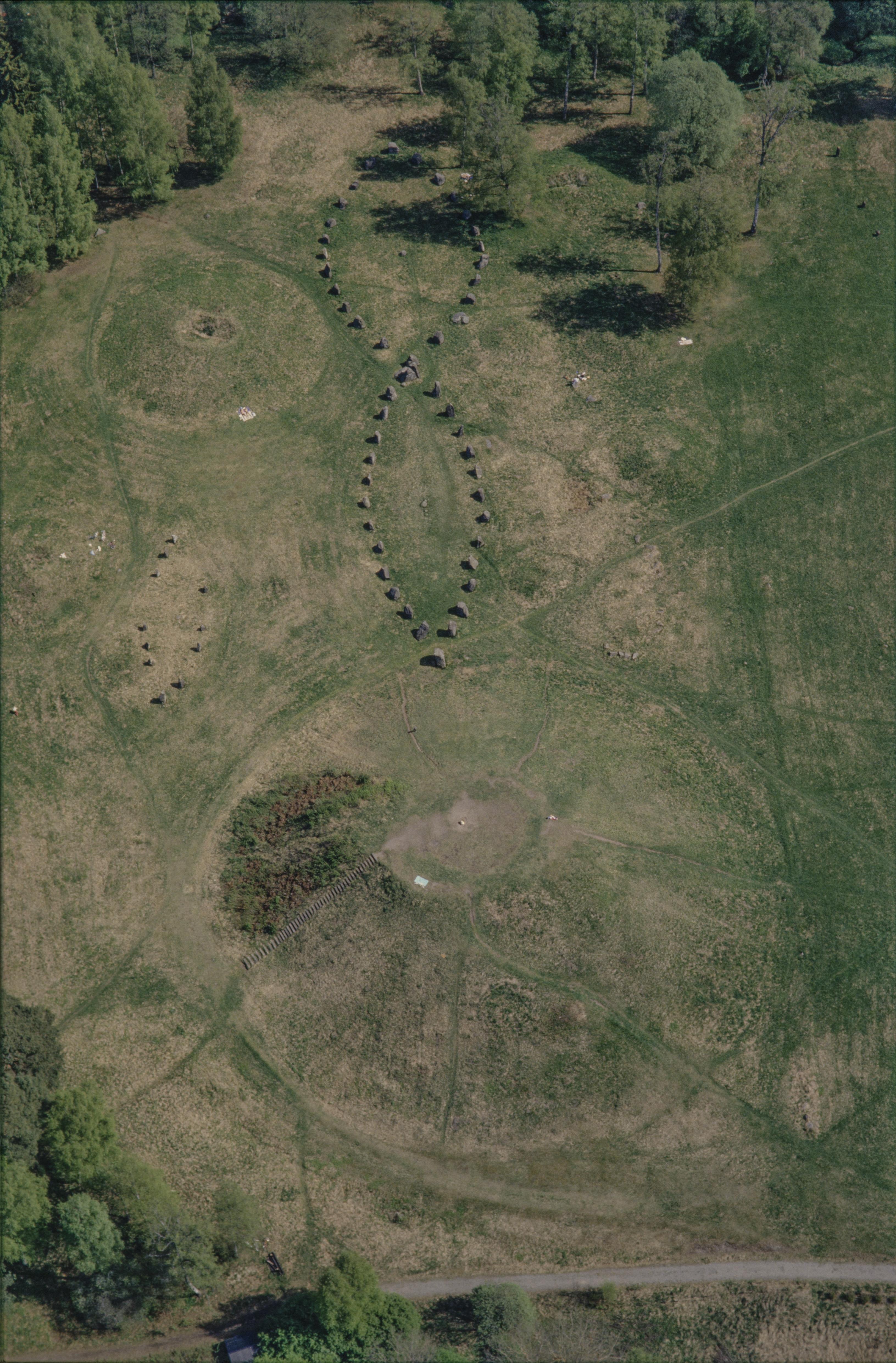 Beskrivning: Fornlämningsområdet Anundshög RAÄnr Västerås 431:1 vid Badelundaåsen i Badelunda. I området finns storhög, skeppssättningar, väglämningar och runsten m.m. Bilden är tagen mot (väderstreck): ONO