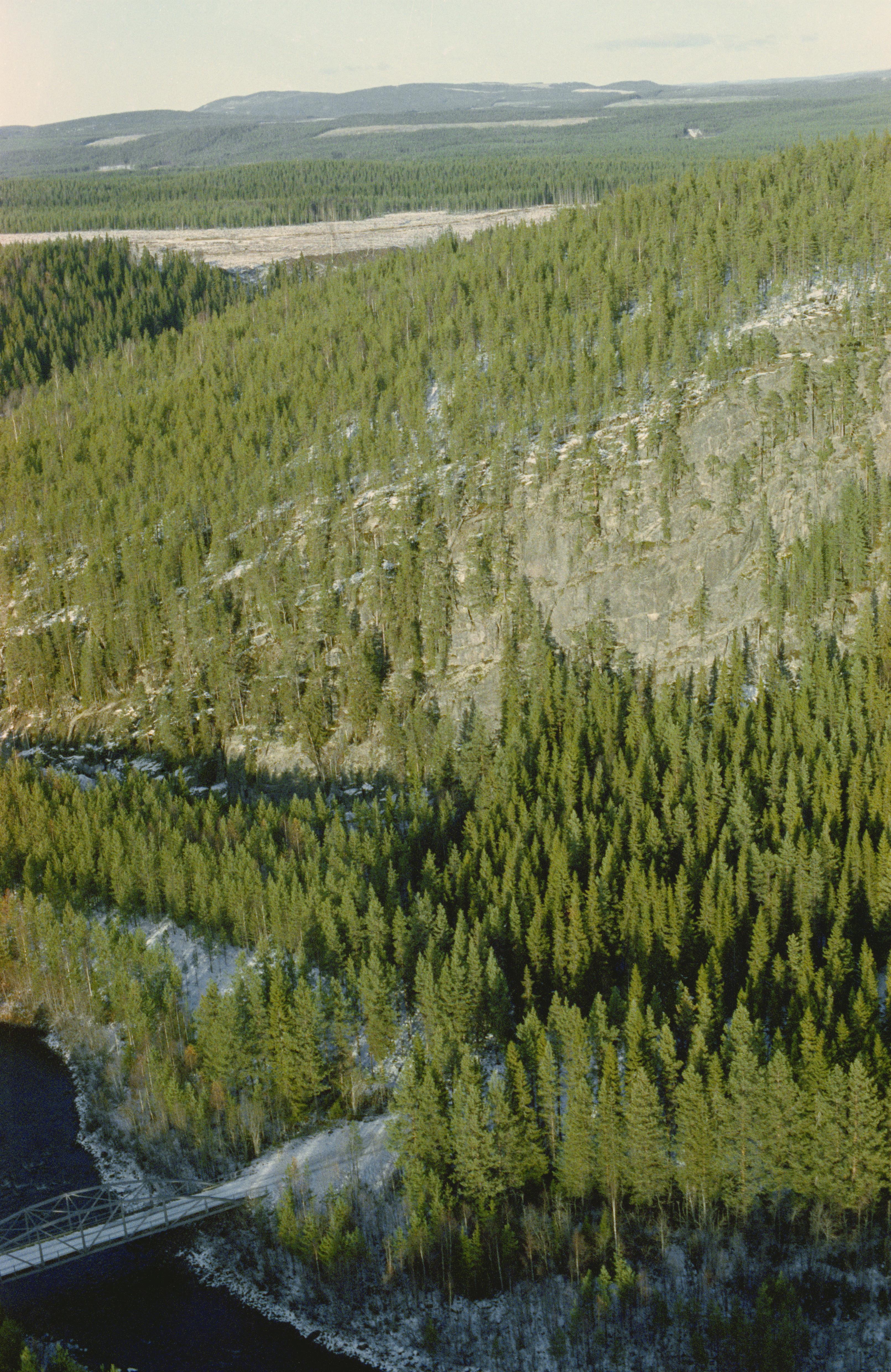 Beskrivning: Brattforsberget vid Storån, Malmån och Vängelälven. I bergsidan vid bildens mitt hällmålningar RAÄnr Fjällsjö 191:1. Bilden är tagen mot (väderstreck): NNO