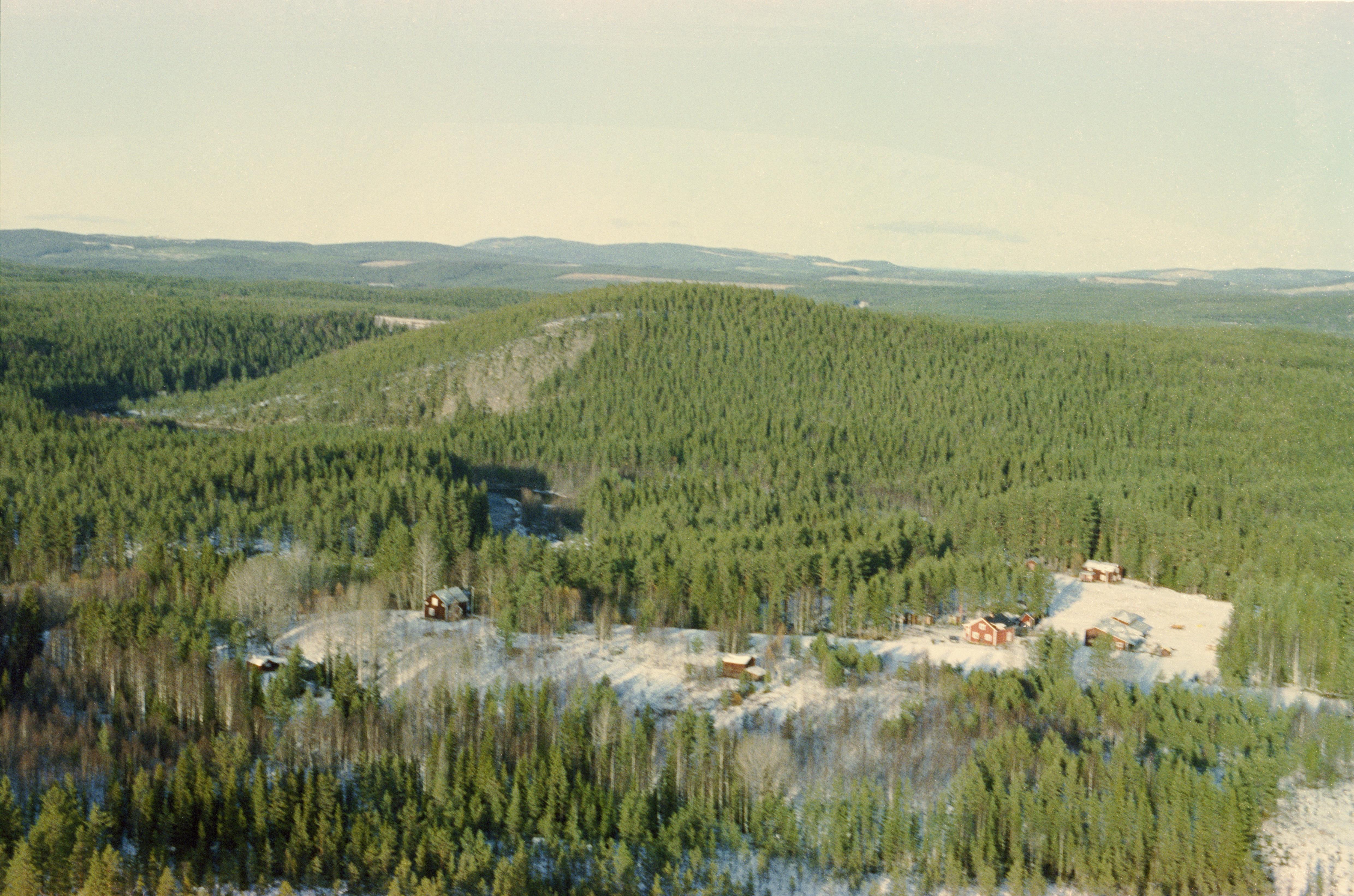 Beskrivning: Brattforsberget vid Storån, Malmån och Vängelälven. I bergsidan till vänster om bildens mitt hällmålningar RAÄnr Fjällsjö 191:1. Bilden är tagen mot (väderstreck): N