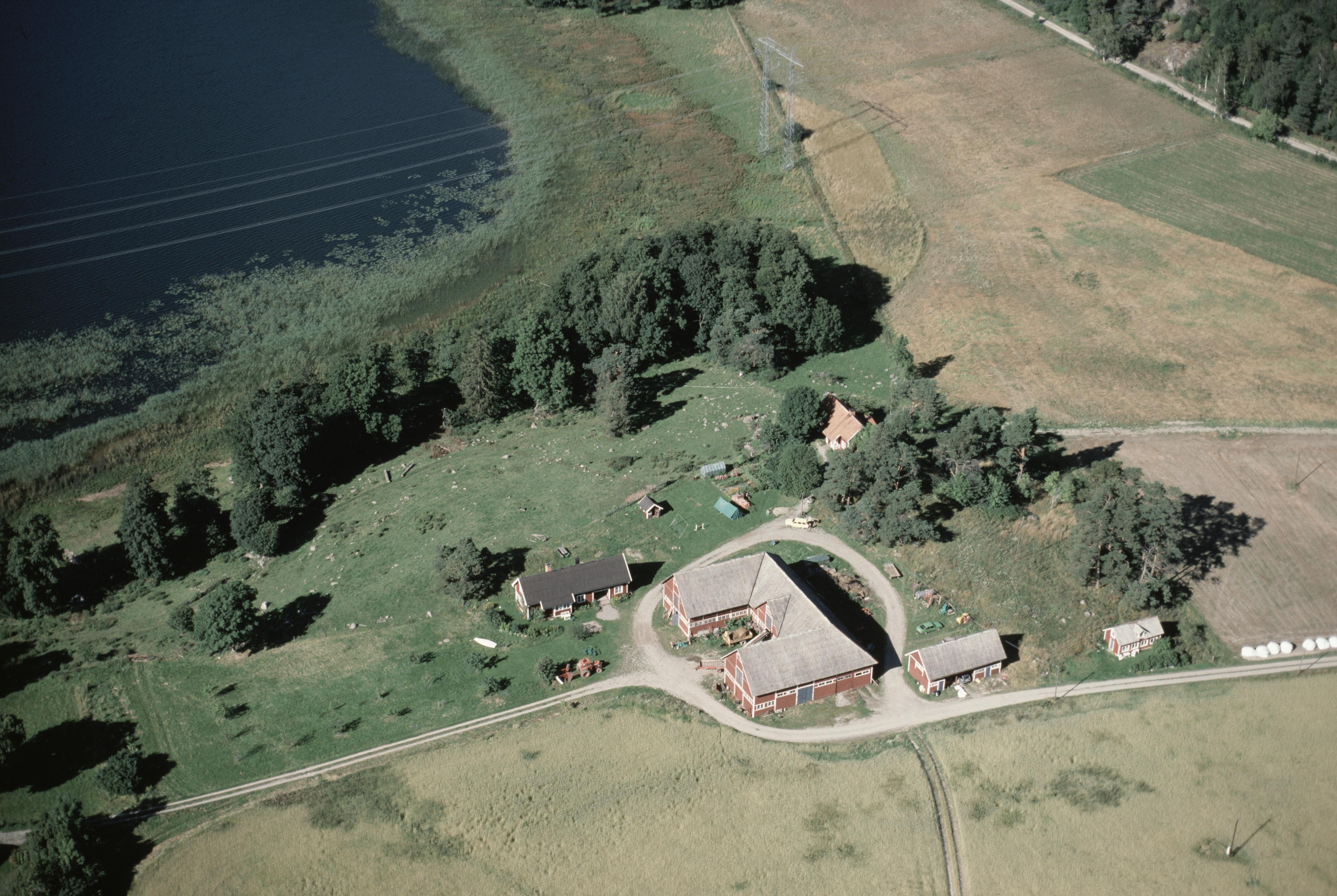 Beskrivning: Stene by. Norra Stene gård vid sjön Sillen. Vid bildens mitt gravfält RAÄnr Vårdinge 204:1. Bilden är tagen mot (väderstreck): N