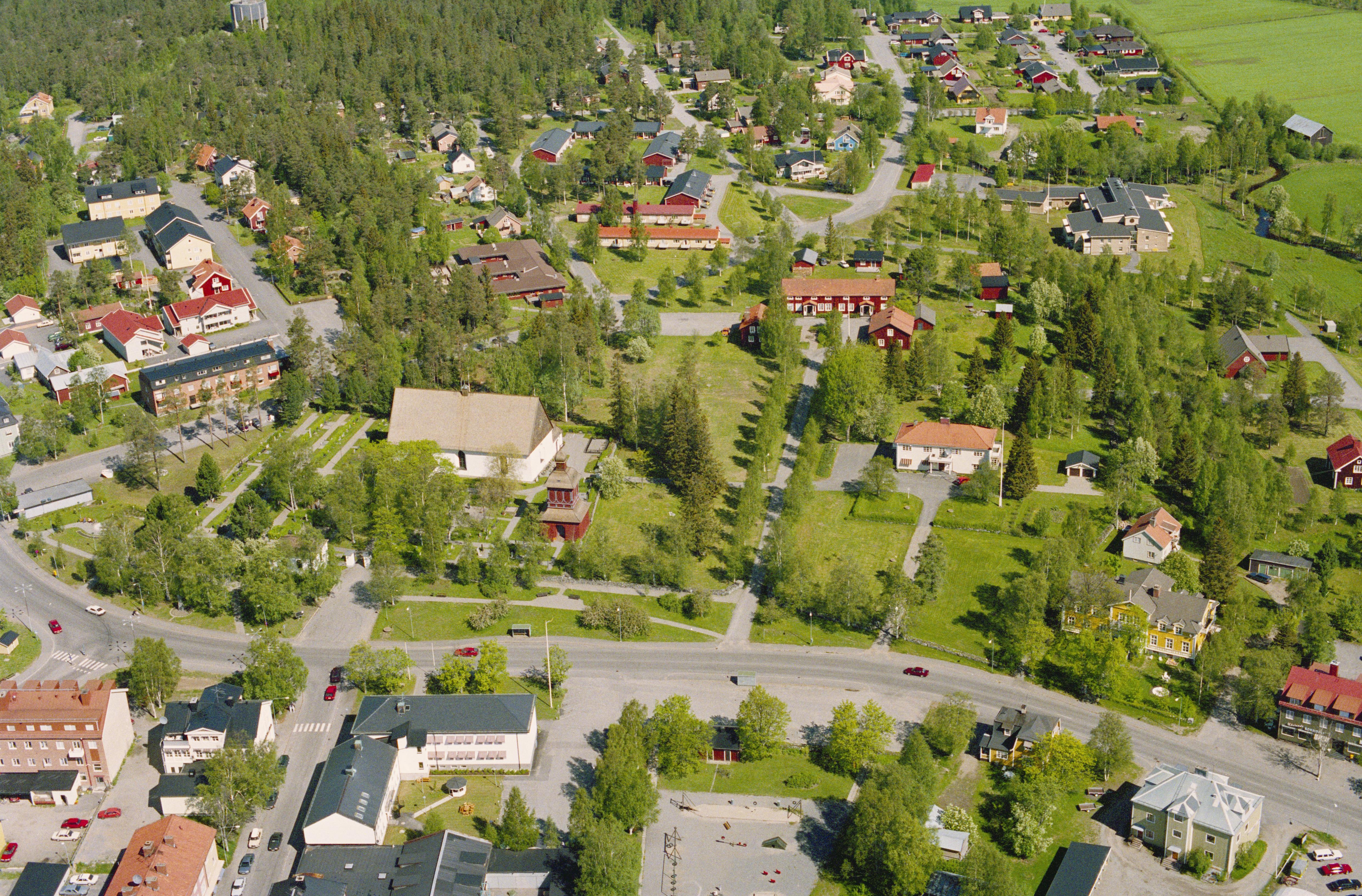 Beskrivning: Nordmalings tätort och kyrkby. Vid bildens mitt Nordmalings kyrka och prästgård i medeltida tomt RAÄnr Nordmaling 996. Bilden är tagen mot (väderstreck): N
