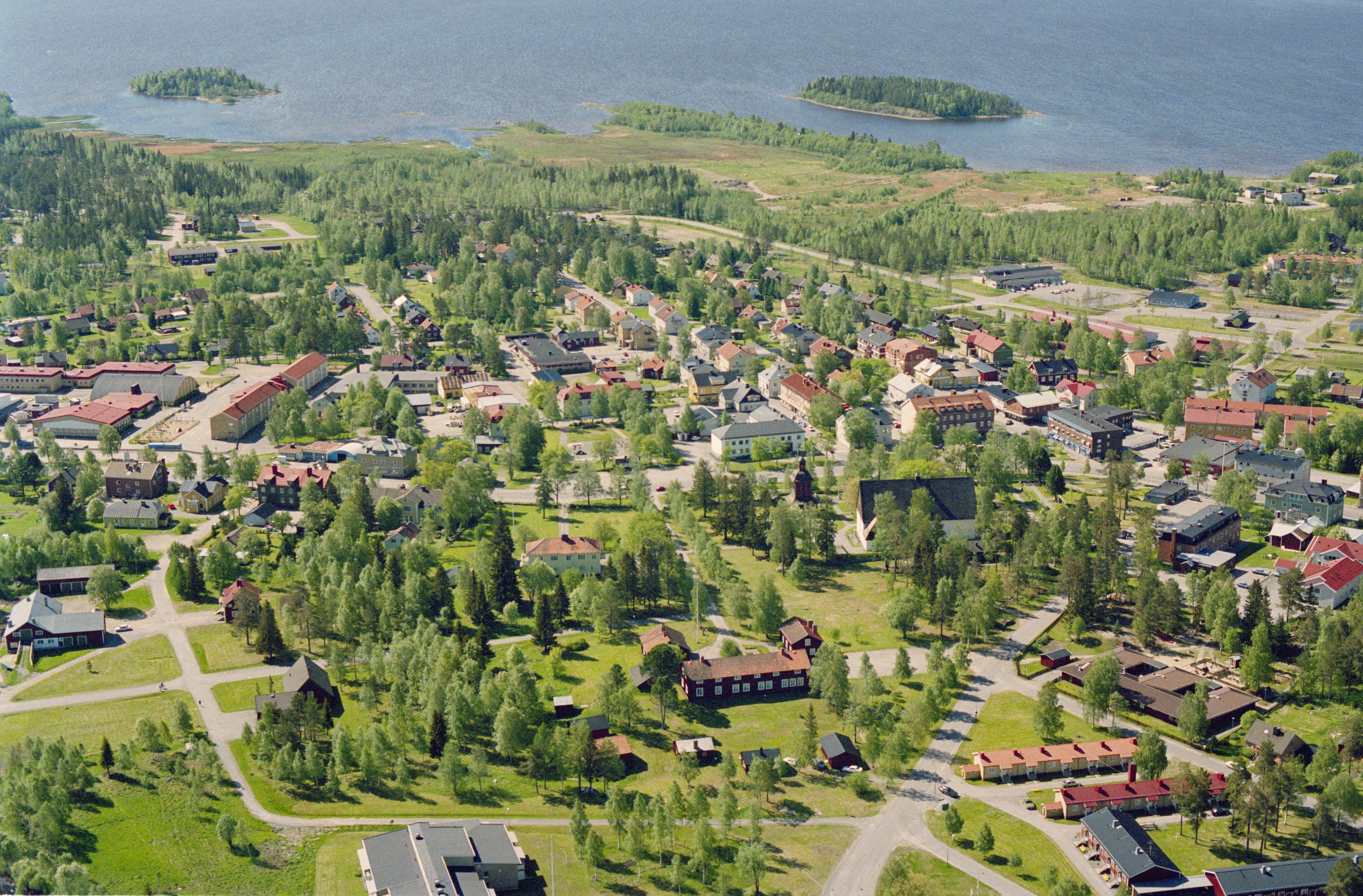 Beskrivning: Nordmalings tätort och kyrkby vid Nordmalingsfjärden. Vid bildens mitt Nordmalings kyrka i medeltida tomt RAÄnr Nordmaling 996. Bilden är tagen mot (väderstreck): S