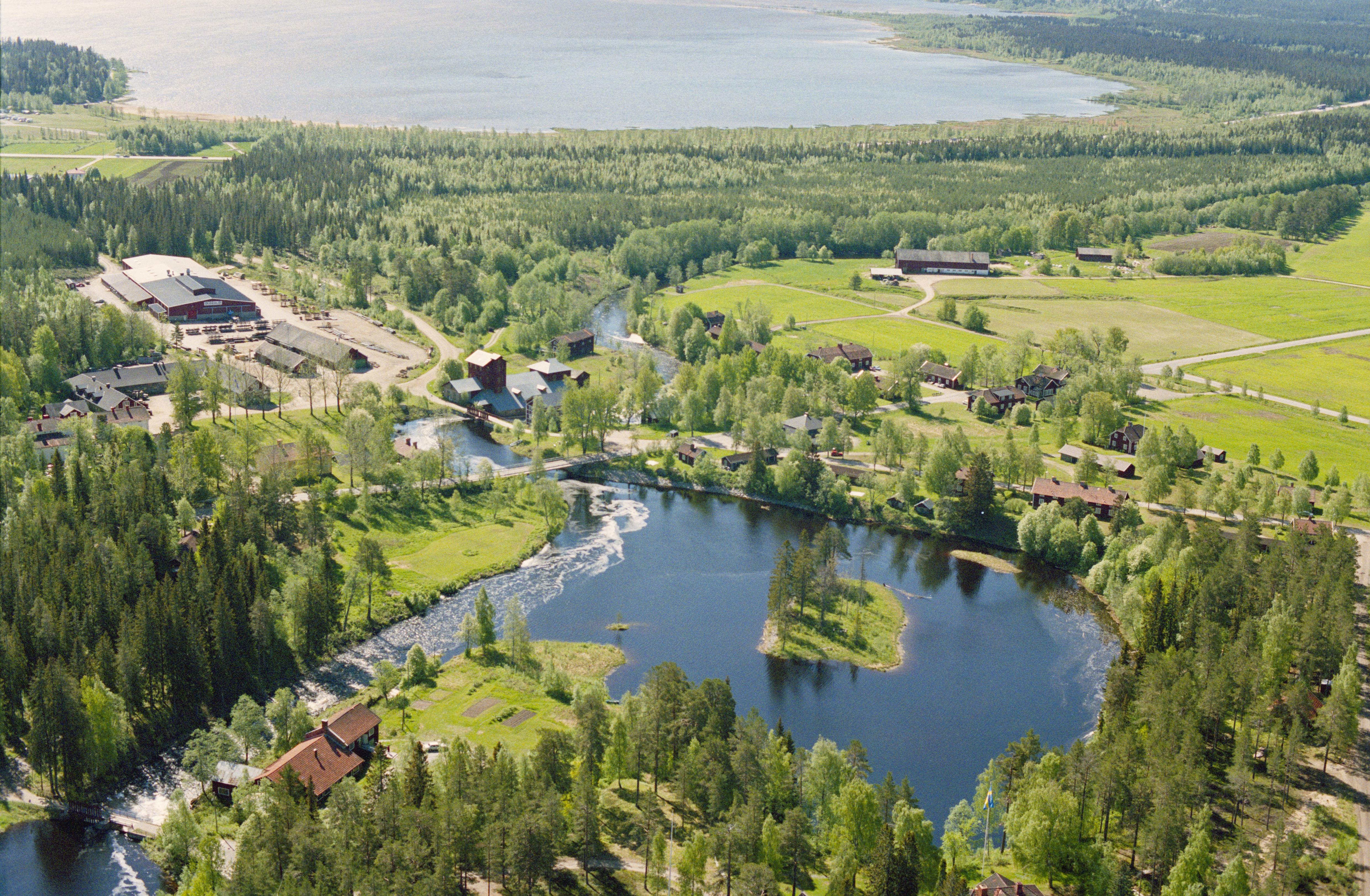 Beskrivning: Olofsfors järnbruk (Olofsfors bruk) vid Leduån. Lustholmen i vattnet till höger under bildens mitt. Olofsfors gamla flygfält vid Nordmalingsfjärden uppe till höger. Bilden är tagen mot (väderstreck): S