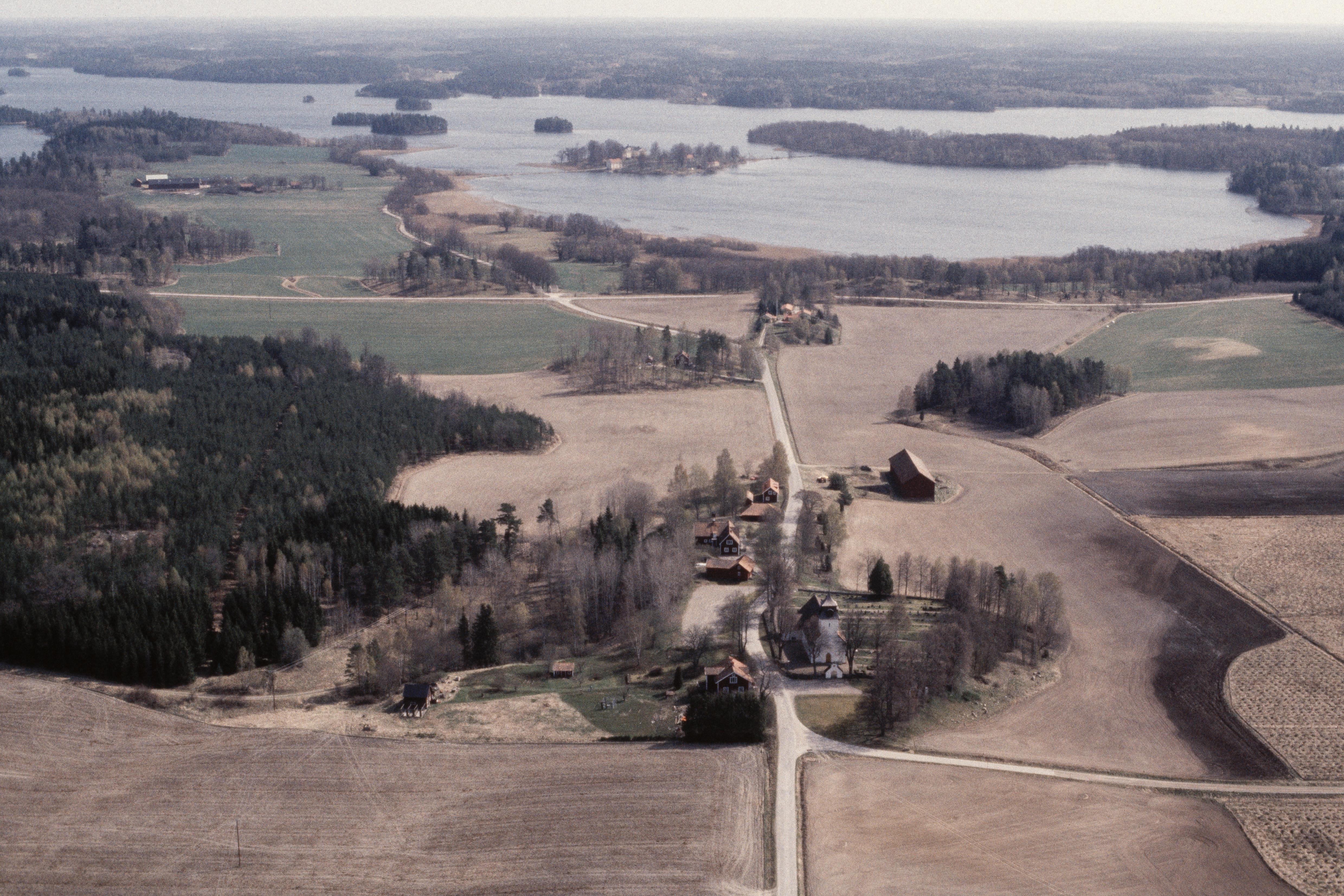 Beskrivning: Årdala kyrka. I bildens övre del Vibyholms slott RAÄnr Årdala 123:1 och till höger Djurön sjön Båven. Bilden är tagen mot (väderstreck): OSO