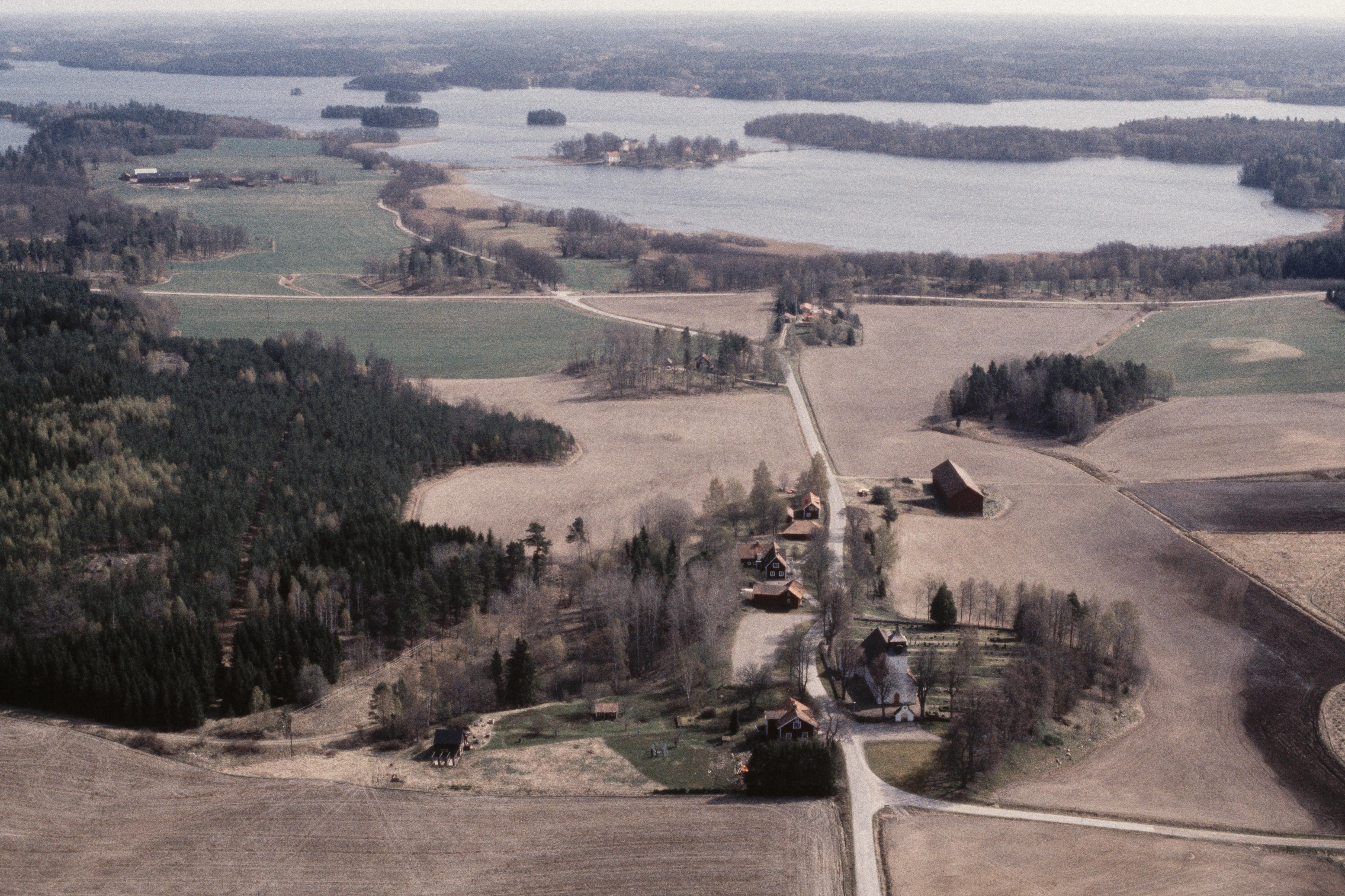 Beskrivning: Årdala kyrka. I bildens övre del Vibyholms slott RAÄnr Årdala 123:1 och till höger Djurön sjön Båven. Bilden är tagen mot (väderstreck): OSO