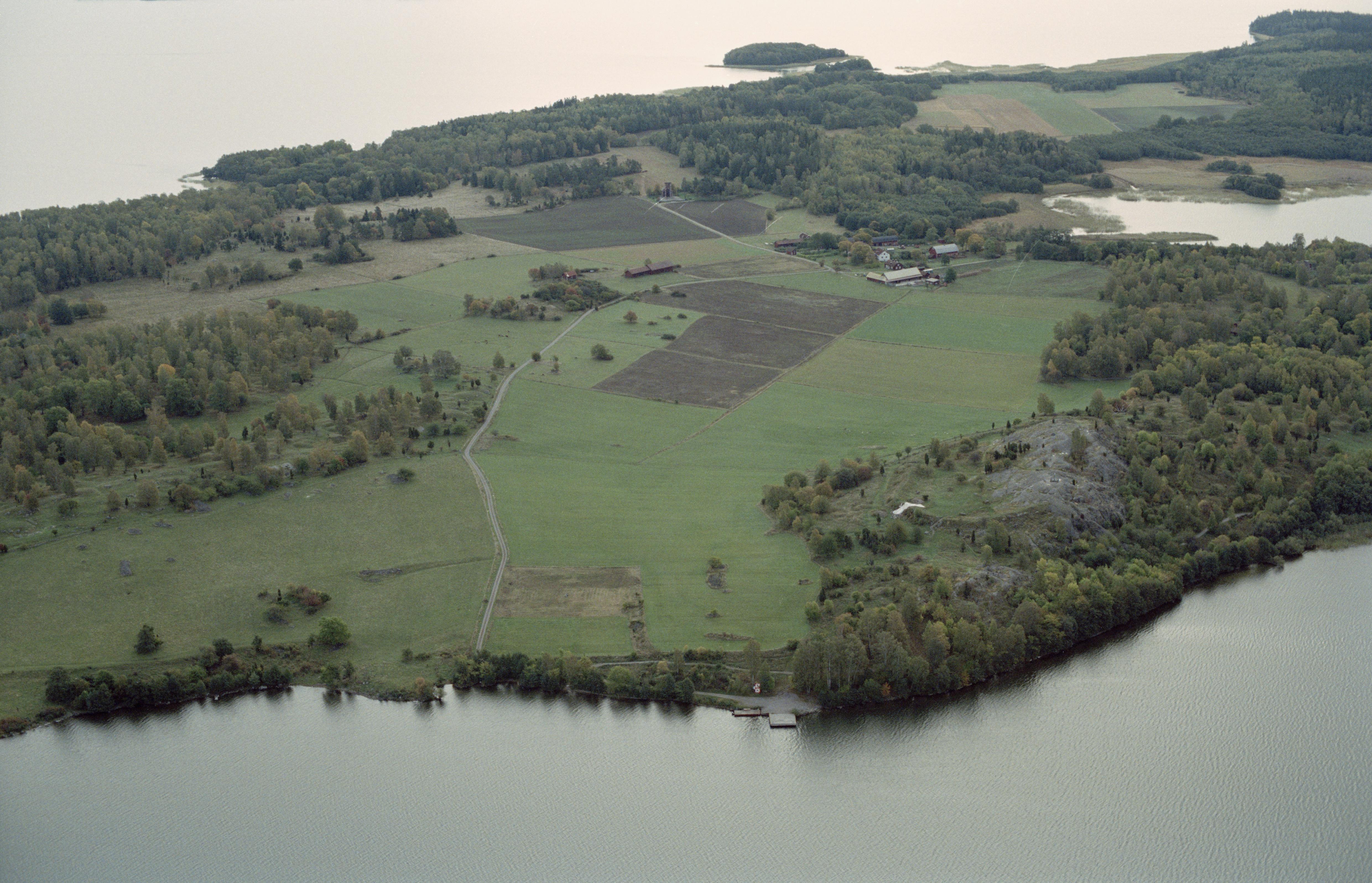 Beskrivning: Fornlämningsområdet Birka på Björkö i Mälaren. Norra delen av ön vid bo- och gravplats Hemlanden och Svarta jorden RAÄnr Adelsö 118:1 vid Stadsvallen Adelsö 119:1-2. Till höger om bildens mitt fornborg Borg RAÄnr Adelsö 34:1 och gravfält Borgs hage Adelsö 35:1. Björkö by vid bildens mitt. Bilden är tagen mot (väderstreck): OSO