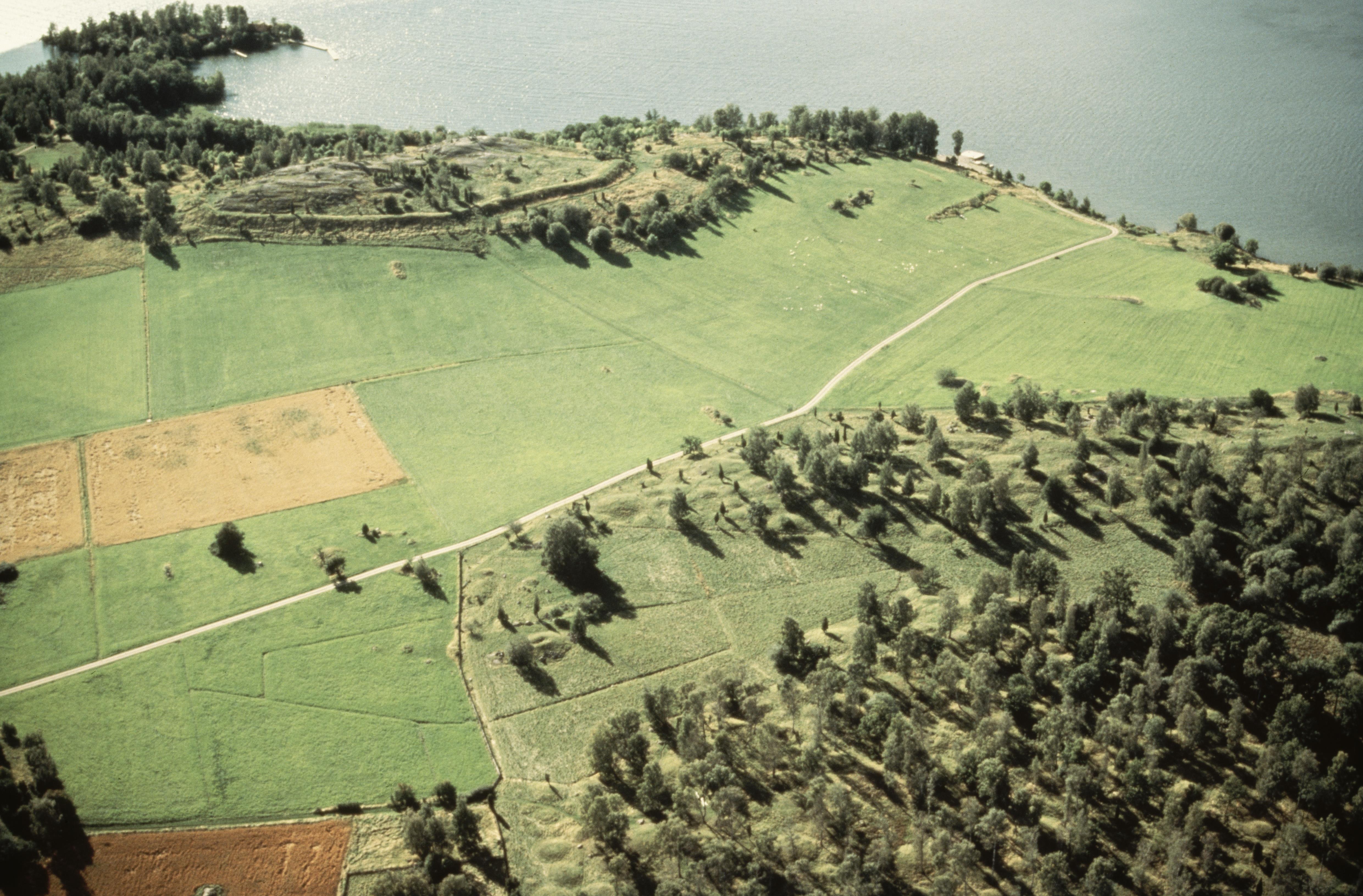 Beskrivning: Fornlämningsområdet Birka på Björkö i Mälaren. Norra delen av ön vid bo- och gravplats Hemlanden och Svarta jorden RAÄnr Adelsö 118:1 vid Stadsvallen Adelsö 119:1-2 m.fl. I bildens övre del gravfält Borgs hage RAÄnr Adelsö 35:1 och fornborg Adelsö 34:1 vid Ångholmen. Bilden är tagen mot (väderstreck): VSV