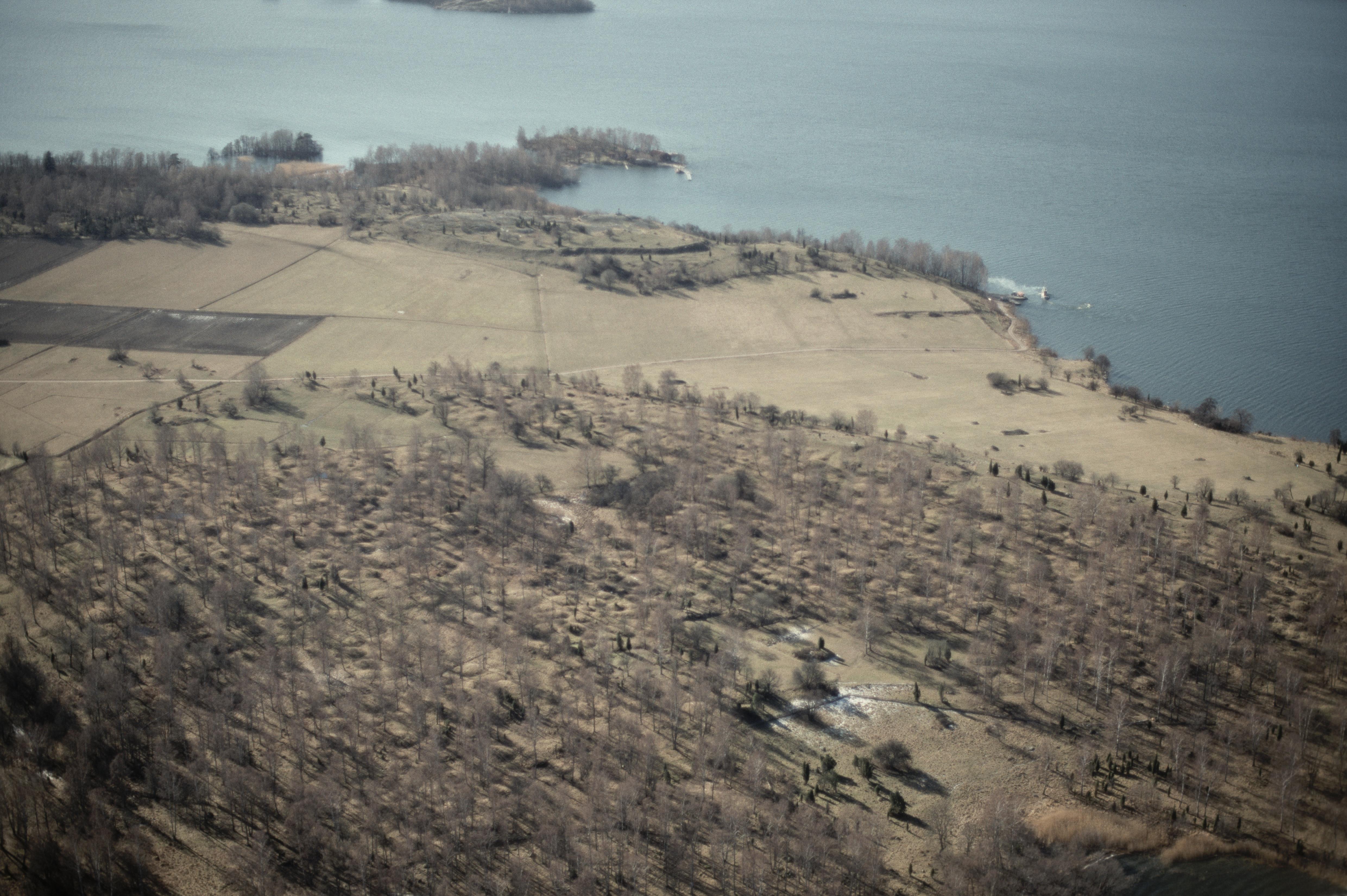 Beskrivning: Fornlämningsområdet Birka på Björkö i Mälaren. Norra delen av ön i området Hemlanden och Svarta jorden RAÄnr Adelsö 118:1 vid Stadsvallen Adelsö 119:1-2. Uppe till vänster gravfält Borgs hage RAÄnr Adelsö 35:1 och fornborg Borg Adelsö 34:1 vid Ångholmen. Bilden är tagen mot (väderstreck): SSV