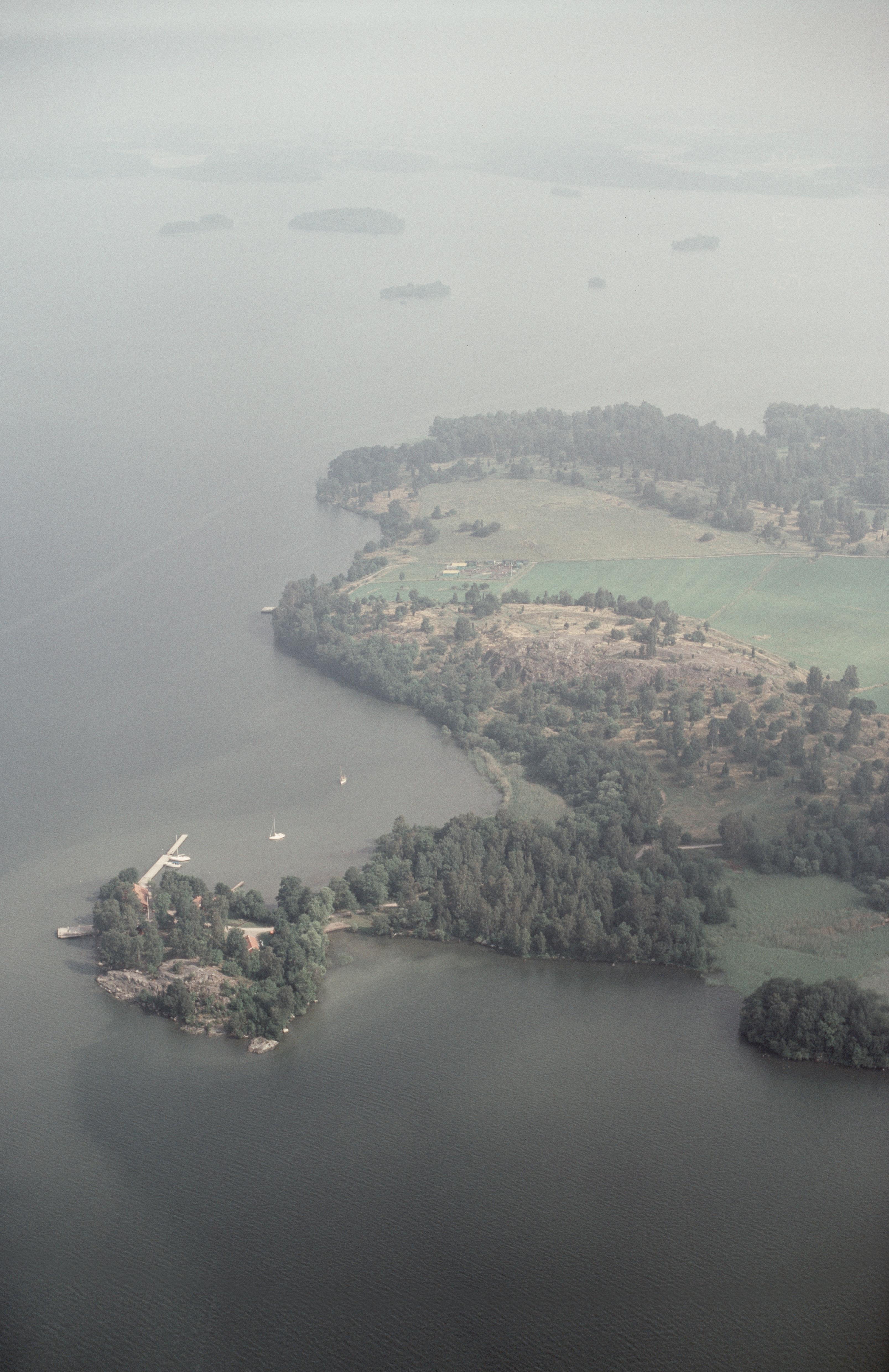 Beskrivning: Fornlämningsområdet Birka på Björkö i Mälaren. Vid bildens mitt fornborg Borg RAÄnr Adelsö 34:1 vid Ångholmen och arkeologisk undersökning i norra delen av ön i bo- och gravplats Hemlanden och Svarta jorden RAÄnr Adelsö 118:1 vid Stadsvallen Adelsö 119:1-2. Bilden är tagen mot (väderstreck): NNO