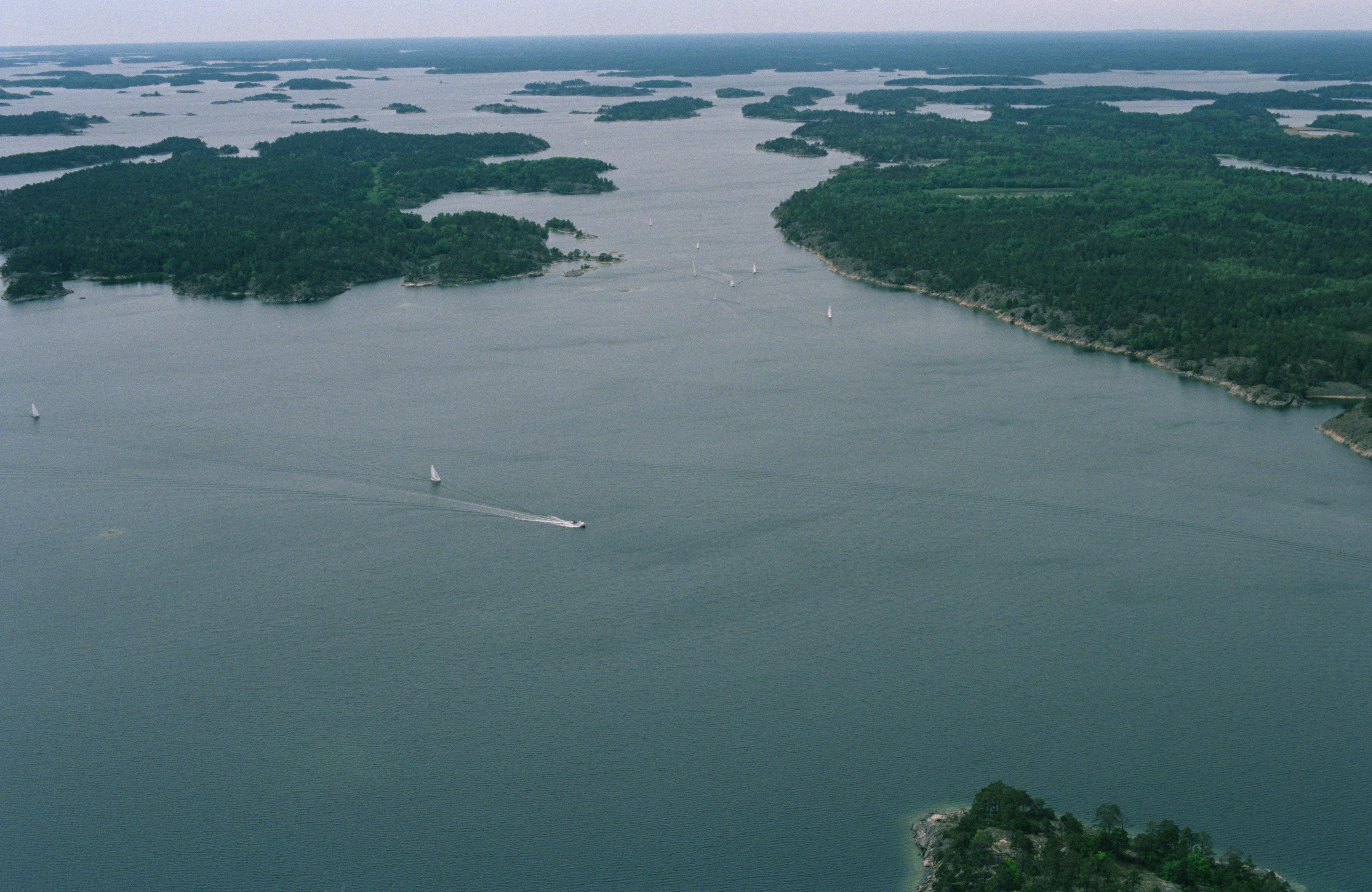 Beskrivning: Gryts skärgård. Sjömärke RAÄnr Gryt 174:1 på Snuggholmen nere till höger. Håskö uppe till vänster, Väggö uppe till höger. Bilden är tagen mot (väderstreck): SSV