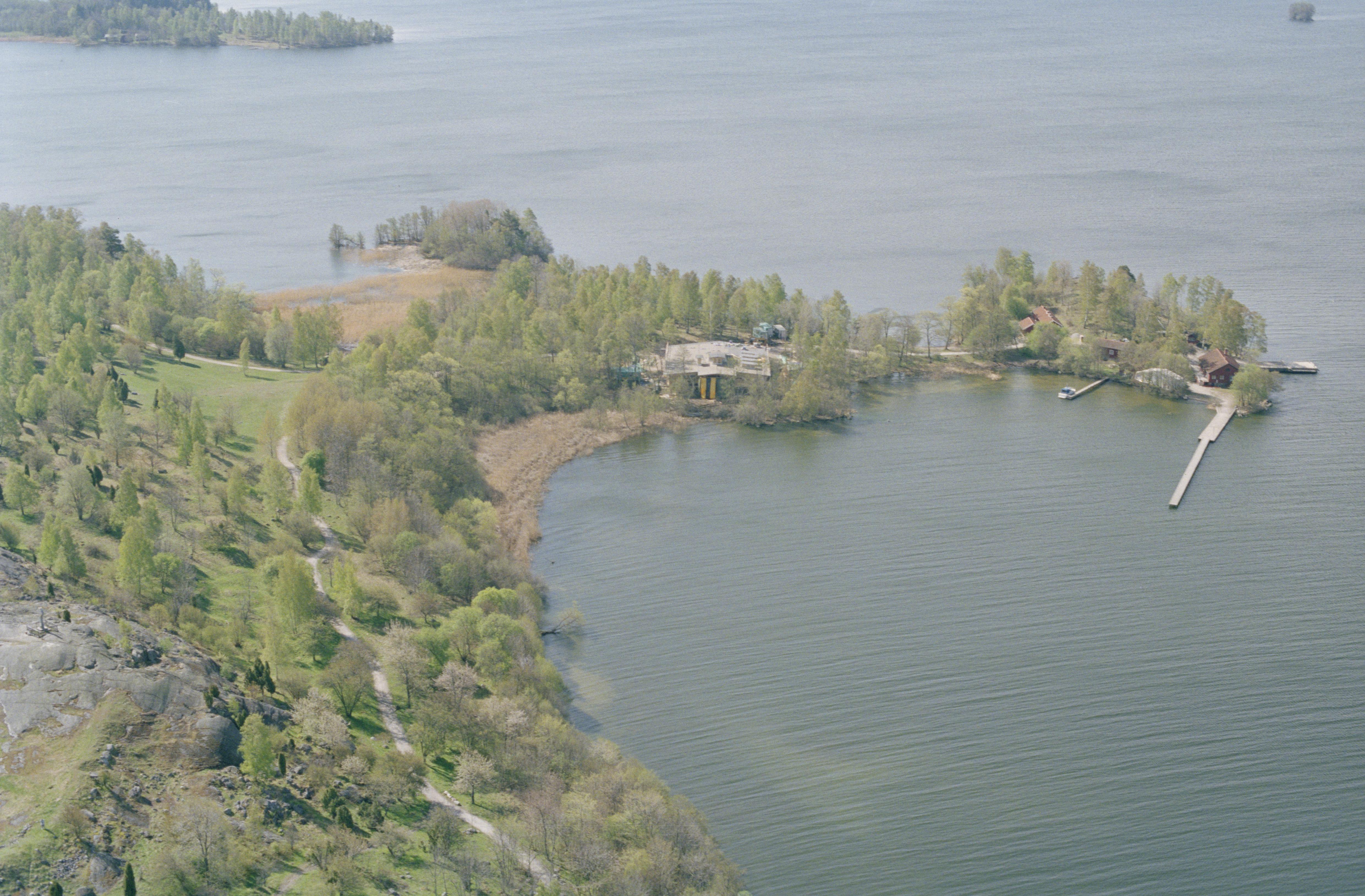 Beskrivning: Fornlämningsområdet Birka på Björkö i Mälaren. Vid bildens mitt Ångholmen, Birka Museum, fornborg Borg RAÄnr Adelsö 34:1 och Ansgarsmonumentet. Bilden är tagen mot (väderstreck): S