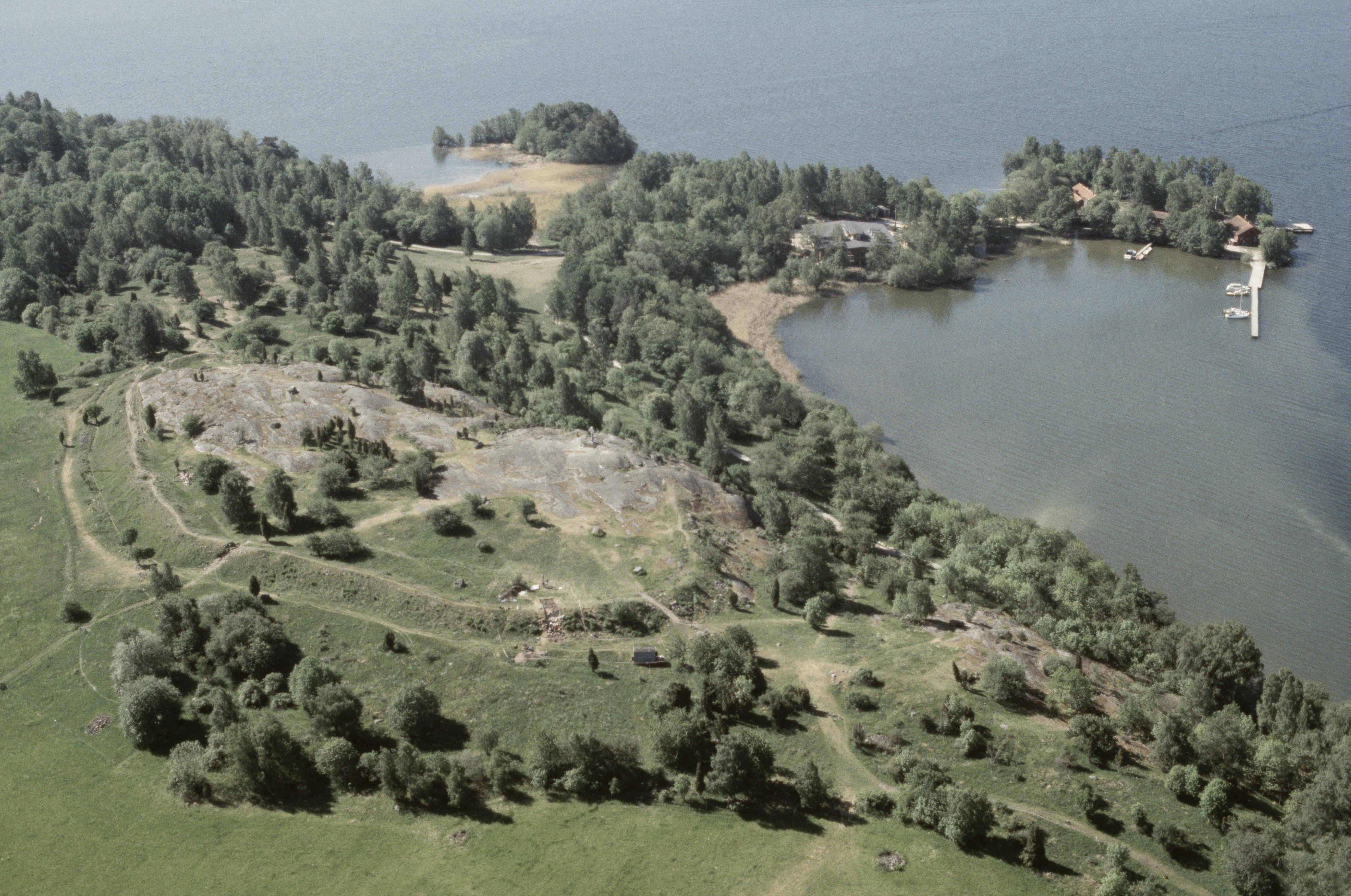 Beskrivning: Fornlämningsområdet Birka på Björkö i Mälaren. Vid bildens mitt arkeologisk undersökning i vallen till fornborg Borg RAÄnr Adelsö 34:1 vid Ansgarsmonumentet. I bildens övre del gravfält Borgs hage RAÄnr Adelsö 35:1 och Birka Museum på Ångholmen. Bilden är tagen mot (väderstreck): SSV
