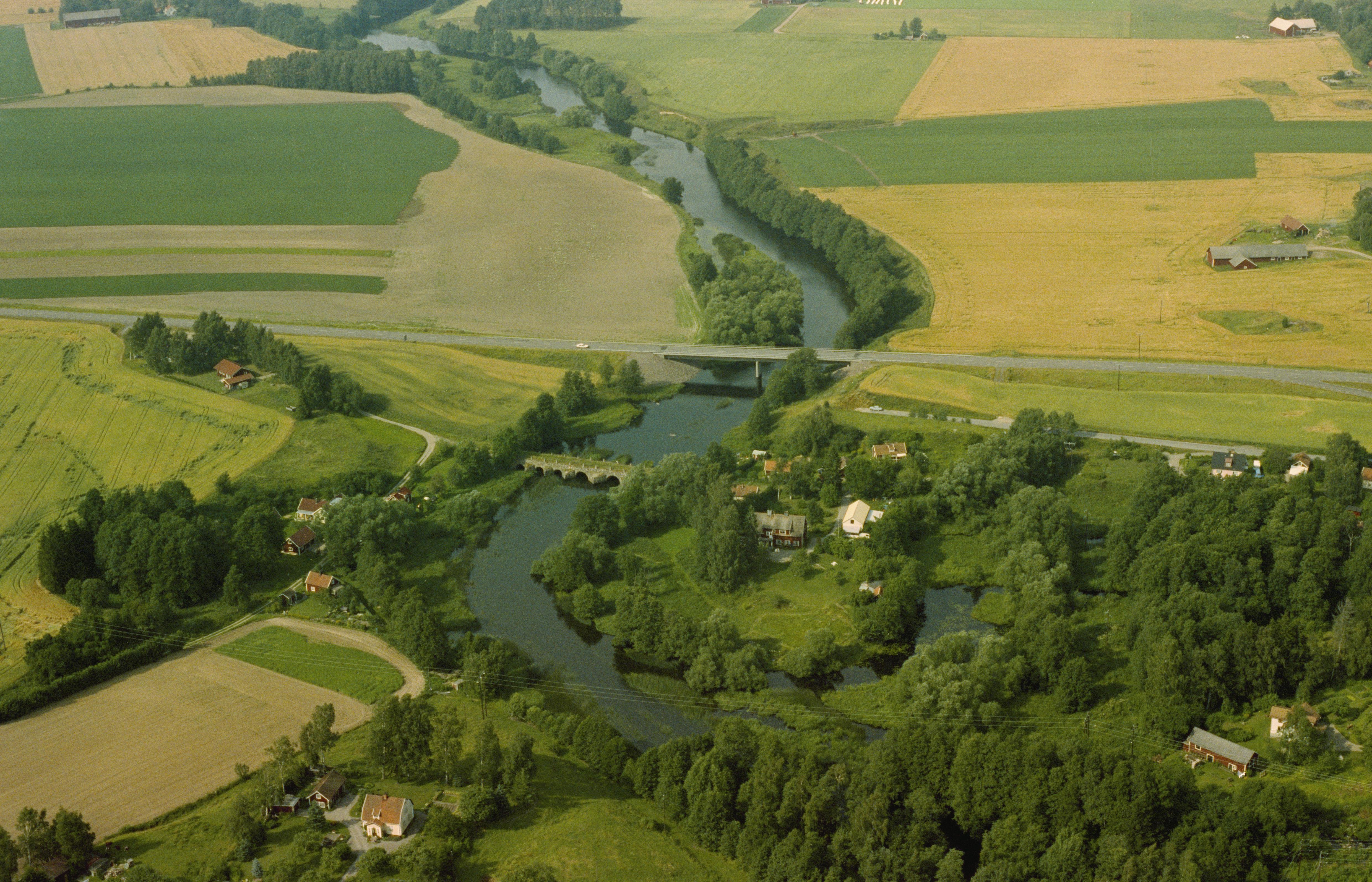 Beskrivning: Öjebro by. Broarna över Svartån. Stenvalvsbro RAÄnr Herrberga 1:1 under bildens mitt. Bilden är tagen mot (väderstreck): N