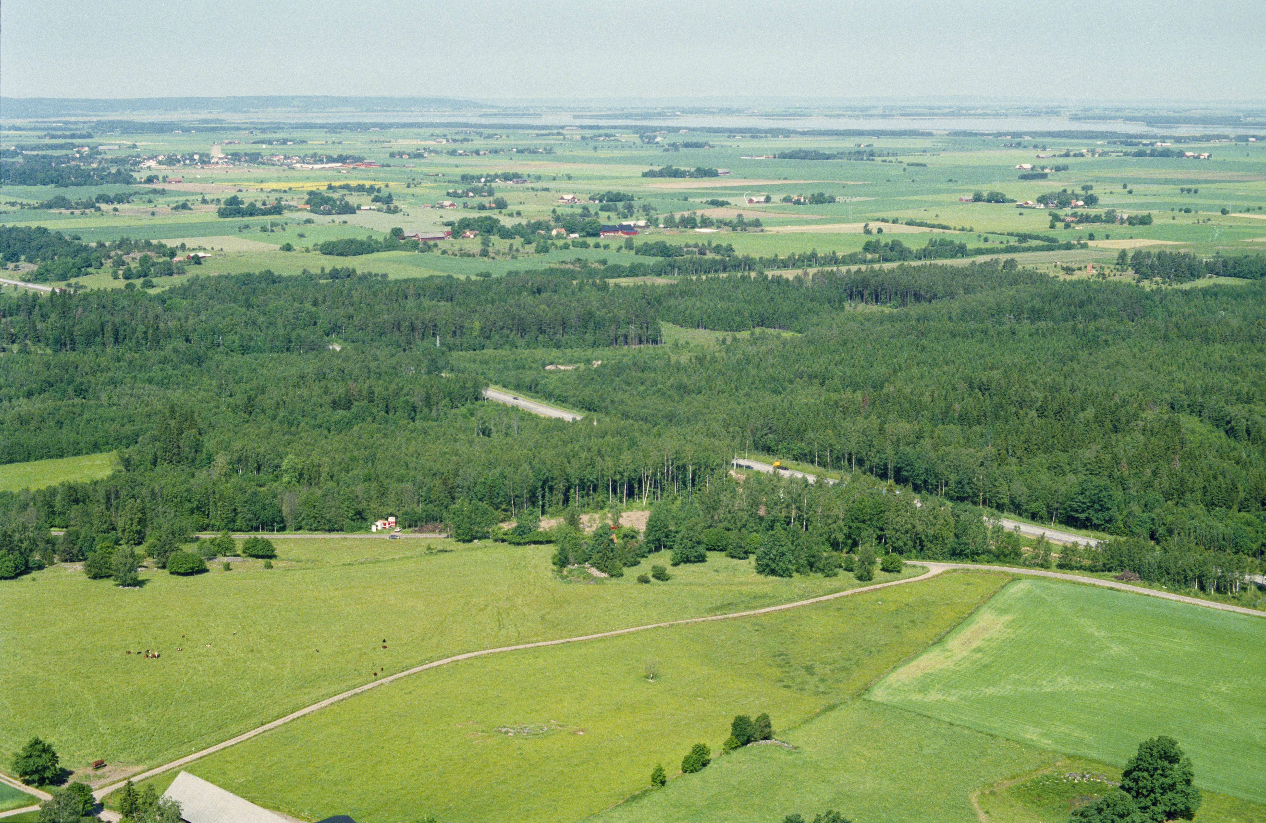 Beskrivning: Arkeologisk undersökning innan bygging av väg E4, vid gränsen mot socknen Hogstad (uppe till höger) och Väderstad (uppe till vänster). Vid bildens mitt hägnad RAÄnr Hogstad 166:1-2. Nere till höger stensättningar RAÄnr Rinna 18:1-3. Bilden är tagen mot (väderstreck): VNV