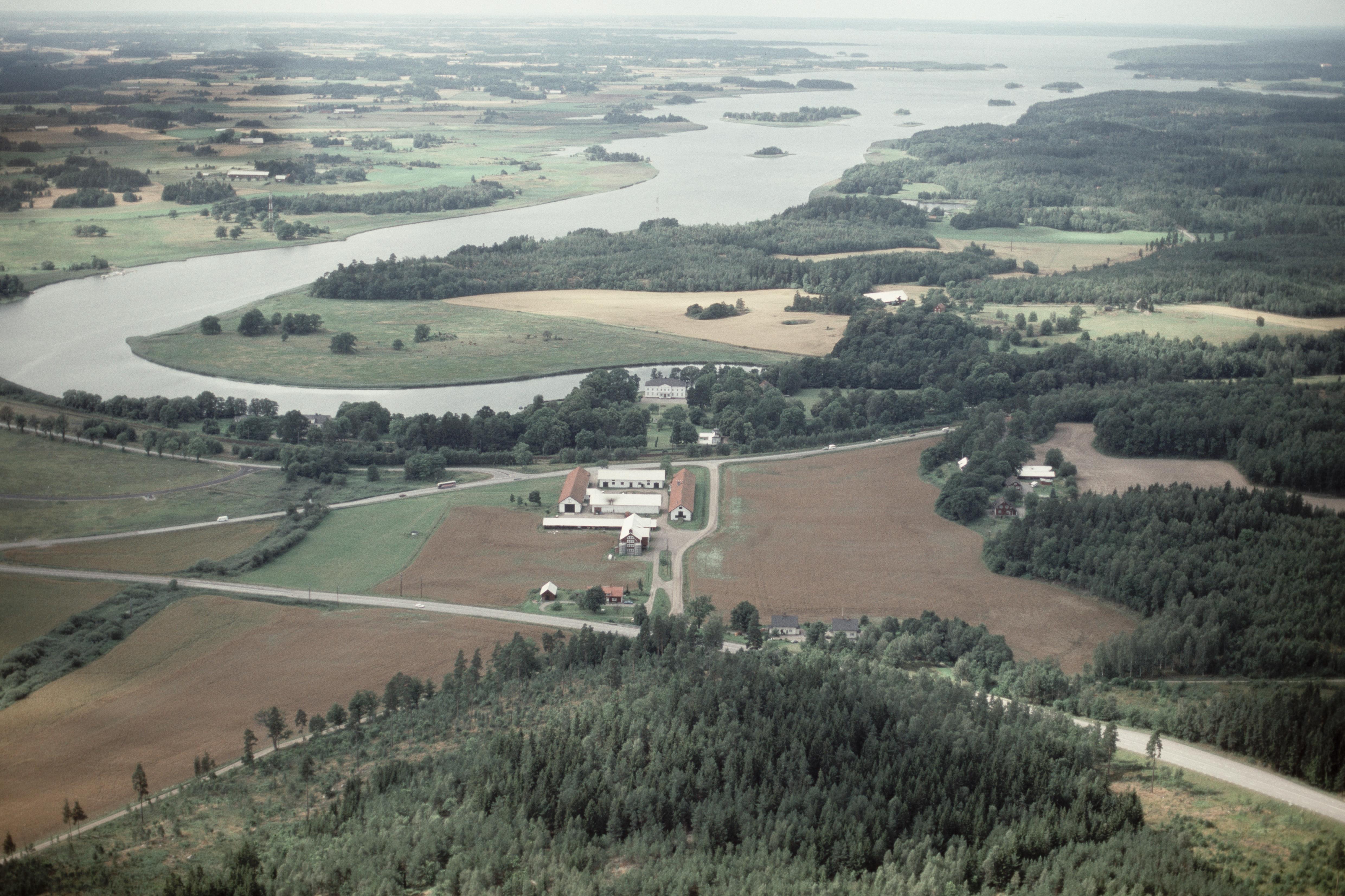 Beskrivning: Motala ström och Göta kanal vid Norsholms herrgård, Över bildens mitt Henriksborgs borgruiner RAÄnr Kimstad 92:1. Uppe till vänster Skärkinds socken. Bilden är tagen mot (väderstreck): V