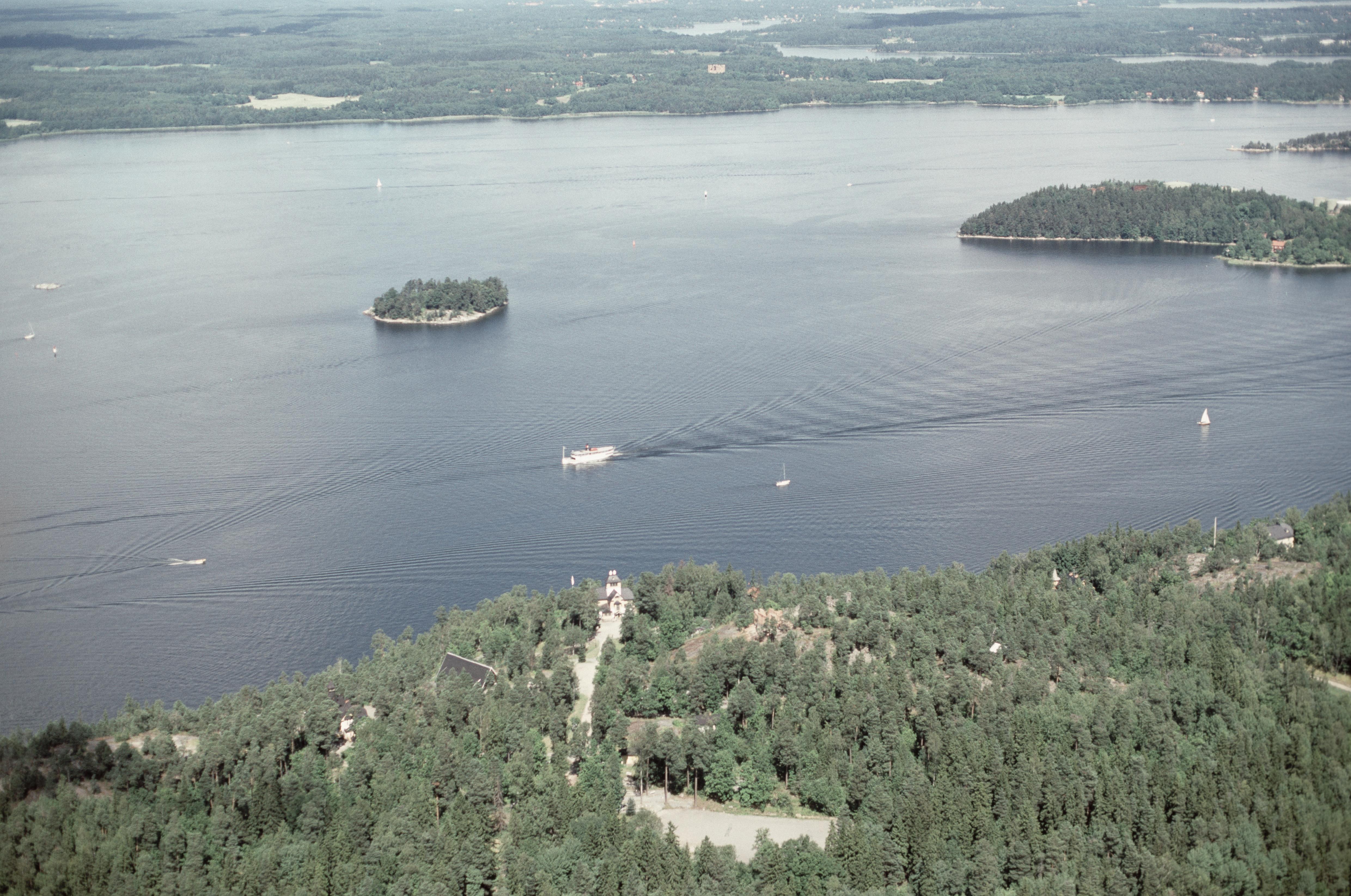 Beskrivning: Båttrafik i Höggarnsfjärden vid öarna Lilla och Stora Höggarn. I bildens nedre del Grävlingsbergs sommarvillor i Kummelnäs. Vid villorna finns en konstgjord "slottsruin". Lidingö socken i bildens övre del. Bilden är tagen mot (väderstreck): NV