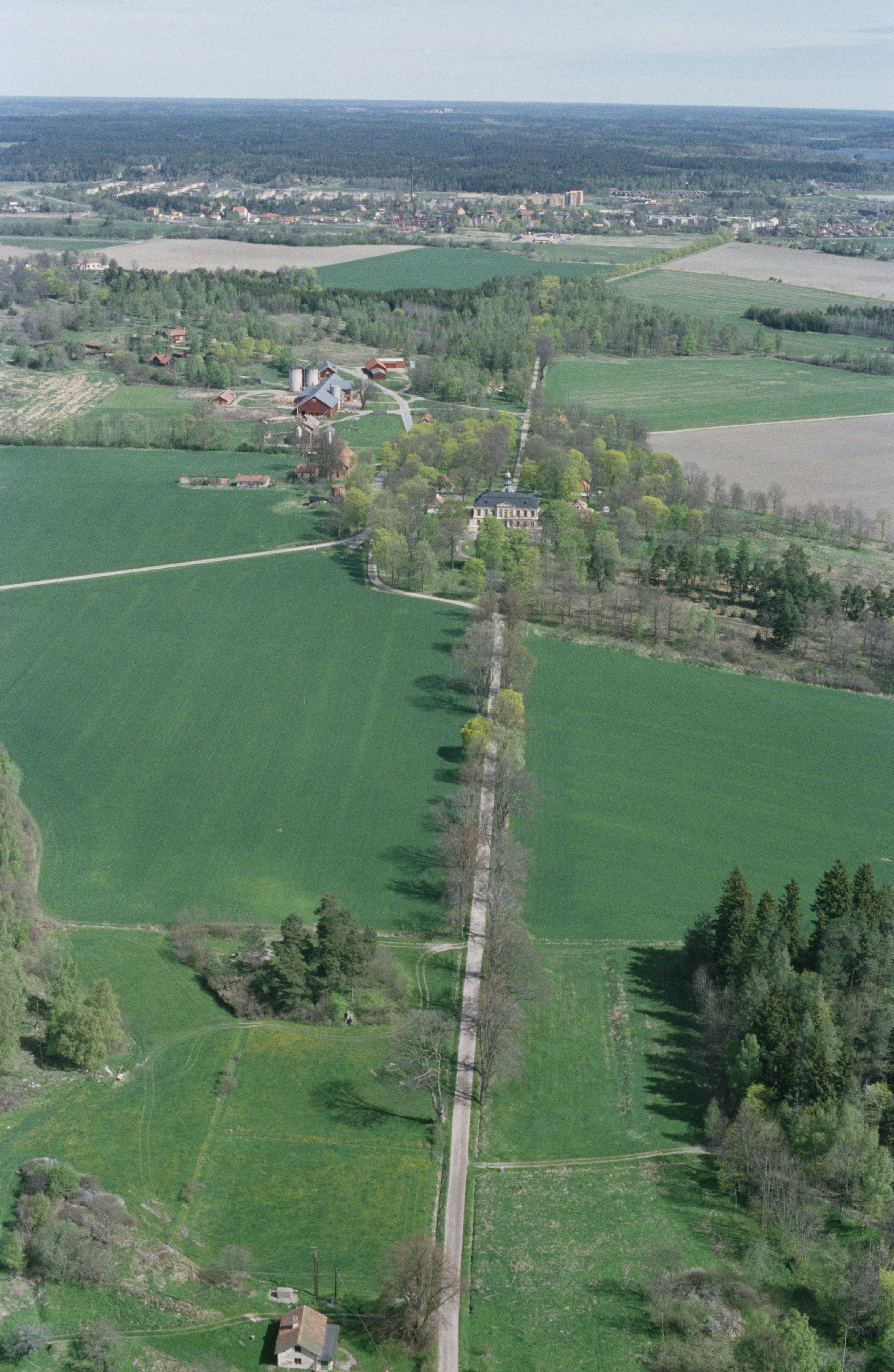Beskrivning: Brogårds herrgård (skrivs även Bro Hof slott). Herrgården har underjordiska gångar till flygelbyggnaderna RAÄnr Bro 91:1. I bildens övre del Bro kyrka, Husby bo- och gravplats RAÄnr Bro 297 och Bro 83:1, Bro tätort m.m. Bilden är tagen mot (väderstreck): NNO
