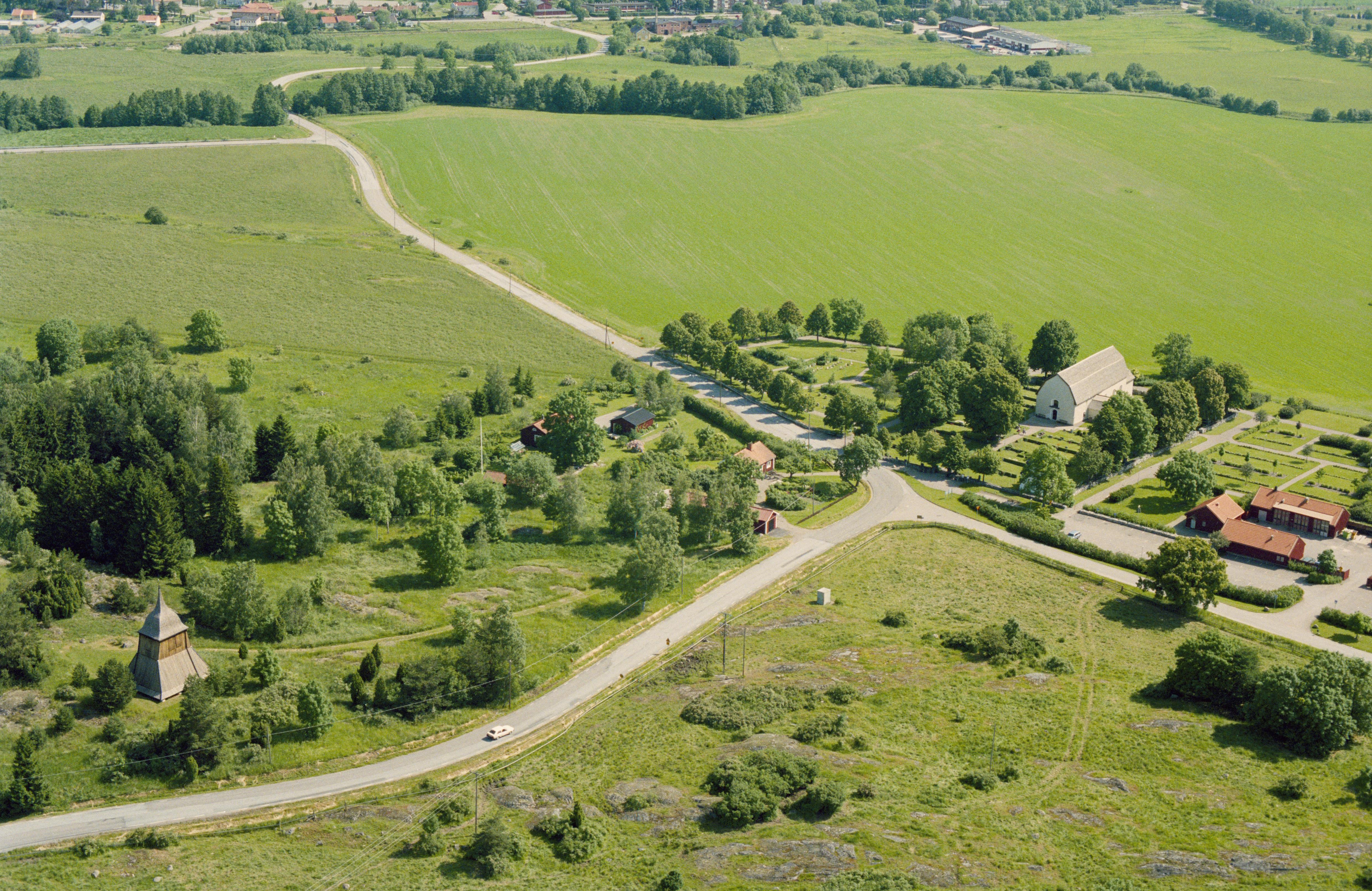 Beskrivning: Bro kyrka vid fornlämningsområdet Husby i Bro. I bildens nedre del Husby boplats och gravfält RAÄnr Bro 297 och Bro 83:1. Bilden är tagen mot (väderstreck): NO