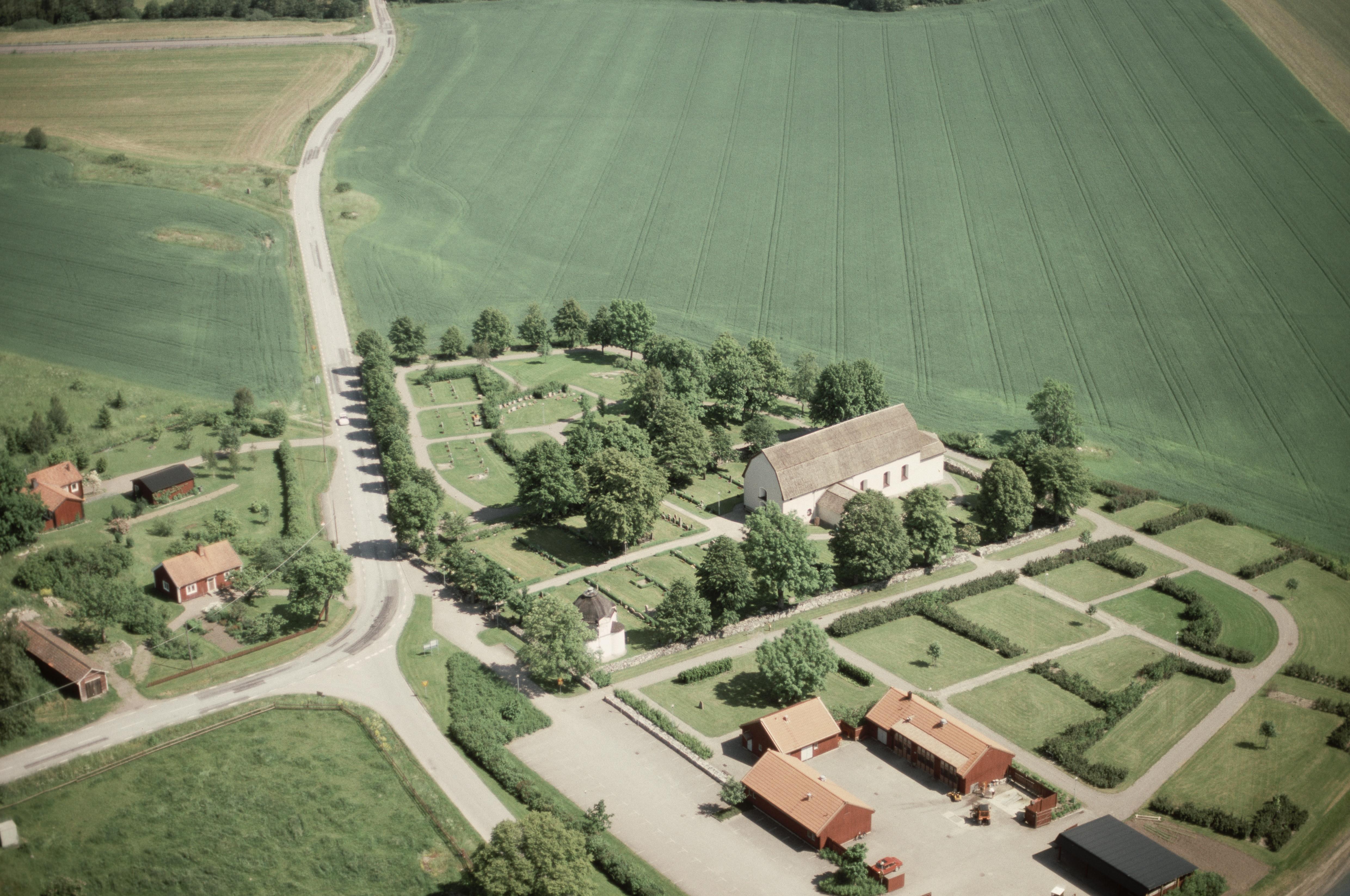 Beskrivning: Bro kyrka vid fornlämningsområdet Husby i Bro. I bildens nedre del Husby boplats och gravfält RAÄnr Bro 297 och Bro 83:1. Bilden är tagen mot (väderstreck): NNO