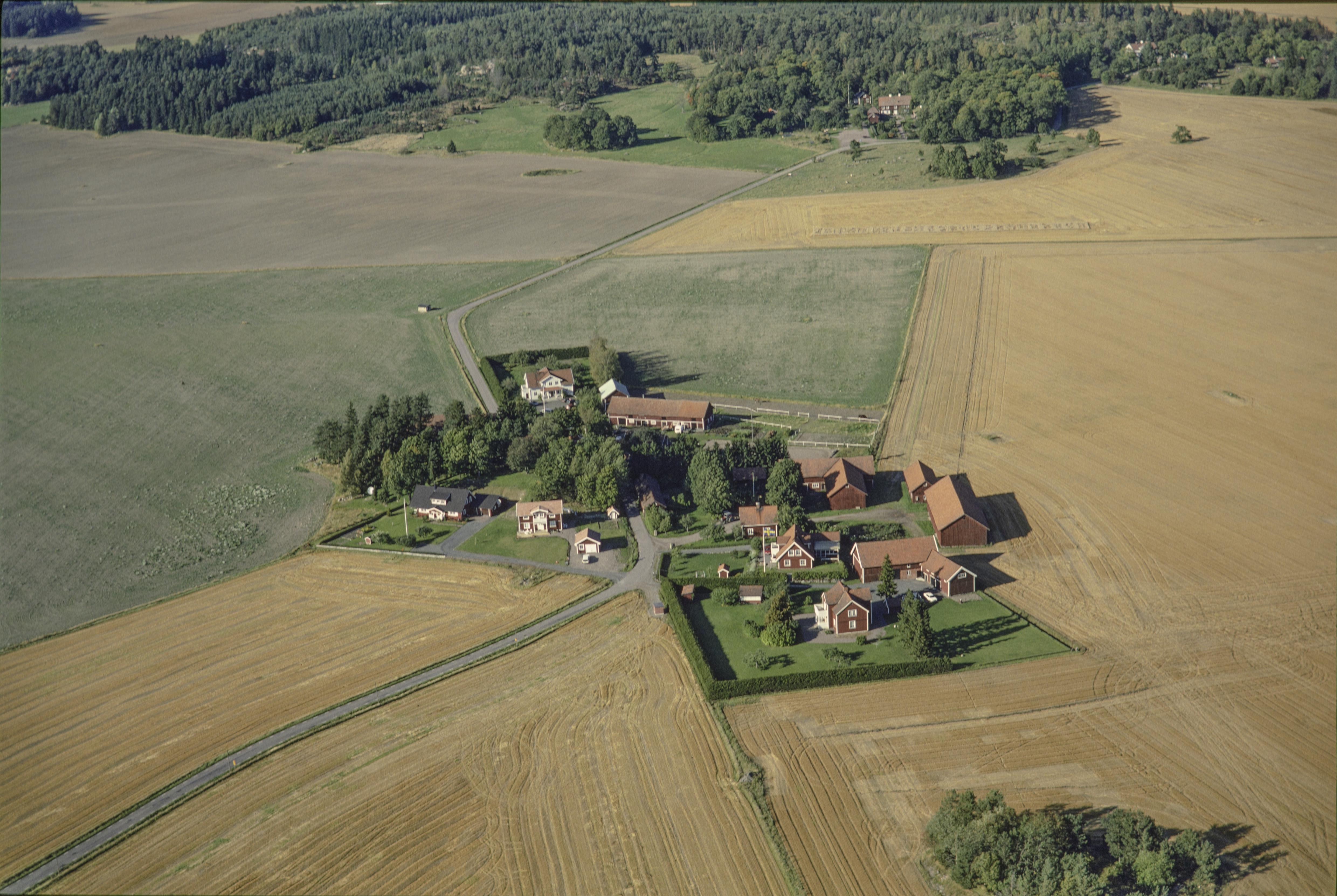 Beskrivning: Edeby gård. På västsidan av gården stensättning RAÄnr Danmark 96:1. I bildens övre del gården Linnés Hammarby. Bilden är tagen mot (väderstreck): N