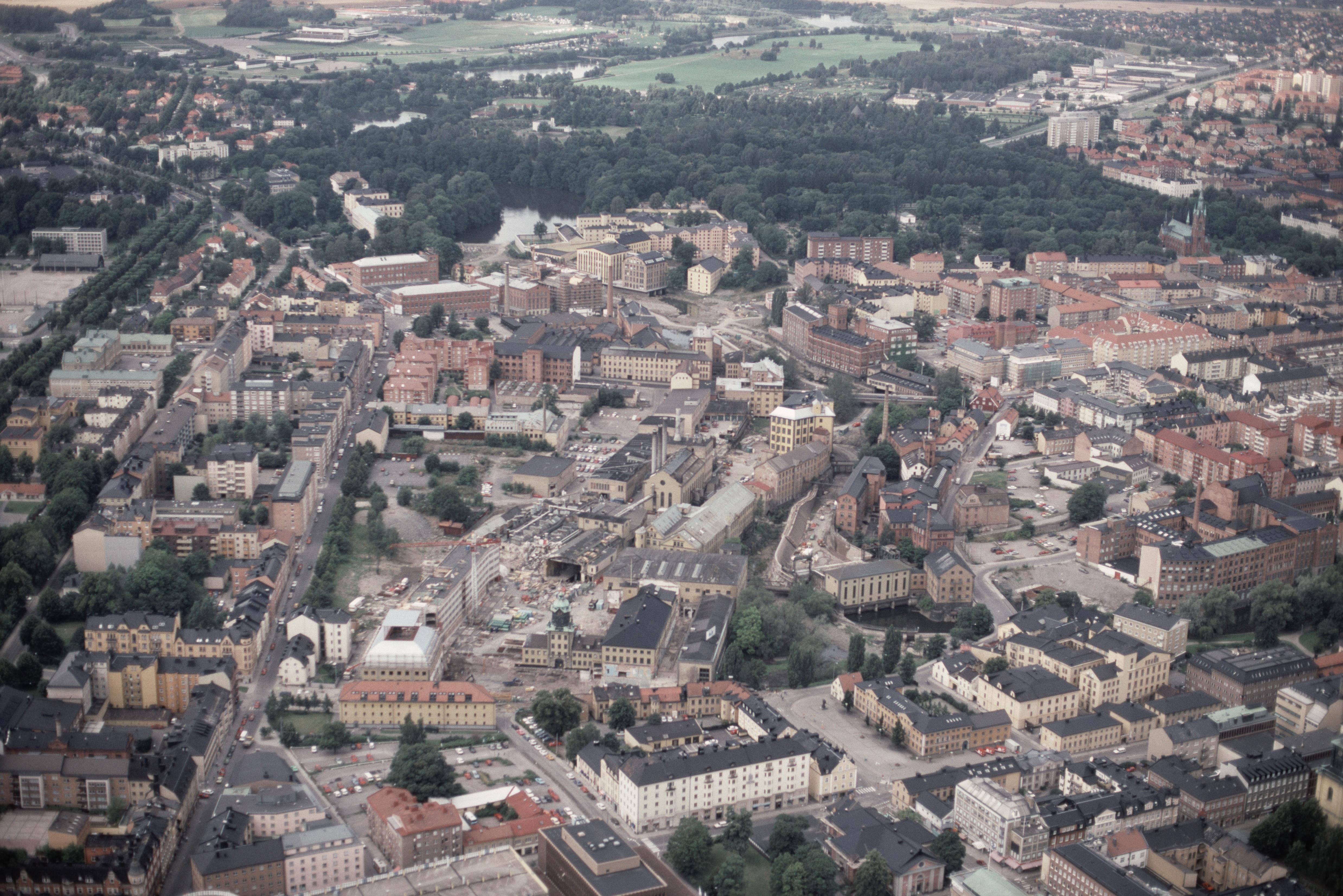 Beskrivning: Gamla staden i Norrköpings stad. Motala ström industristad (torrlagd). Sankt Olai kyrka nere till höger och Matteus kyrka uppe till höger vid bildens mitt. Bilden är tagen mot (väderstreck): V