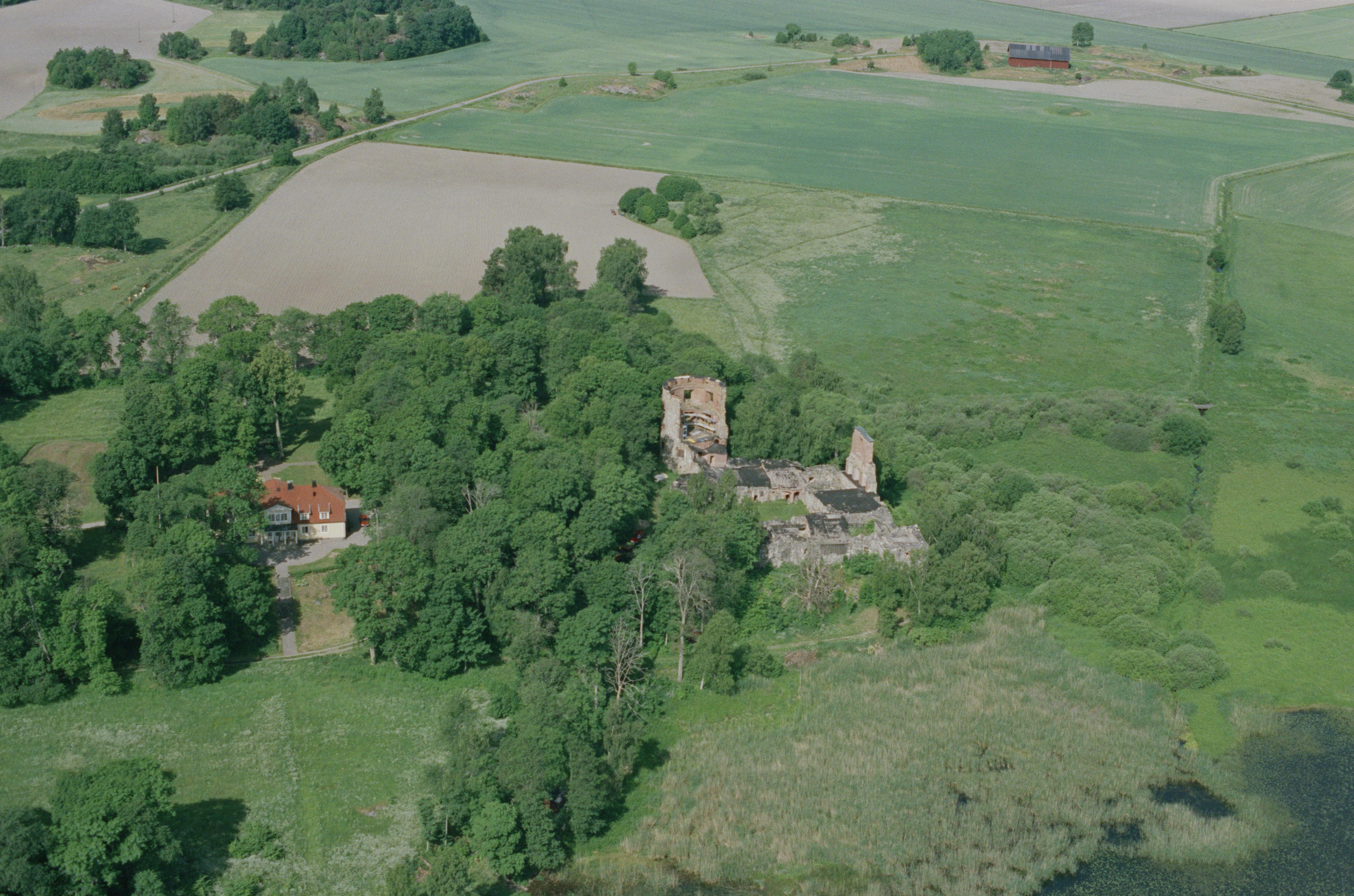 Beskrivning: Mörbyviken i sjön Skedviken. Till vänster om bildens mitt Mörby gård. Vid bildens mitt Mörby slottsruin RAÄnr Fasterna 49:1. Bilden är tagen mot (väderstreck): NV