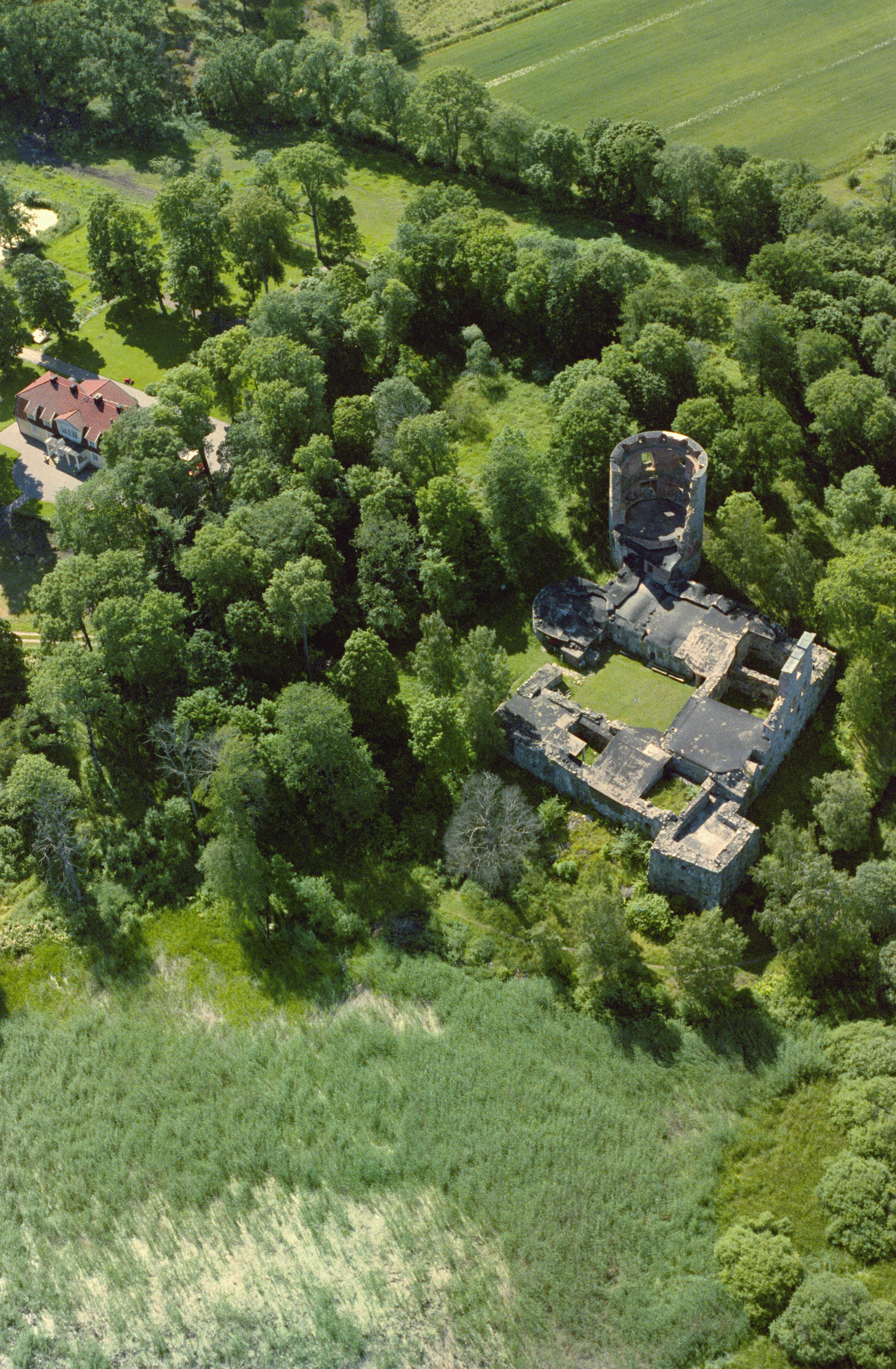 Beskrivning: Mörbyviken i sjön Skedviken. Till höger om bildens mitt Mörby slottsruin RAÄnr Fasterna 49:1. Uppe till vänster Mörby gård. Bilden är tagen mot (väderstreck): VSV