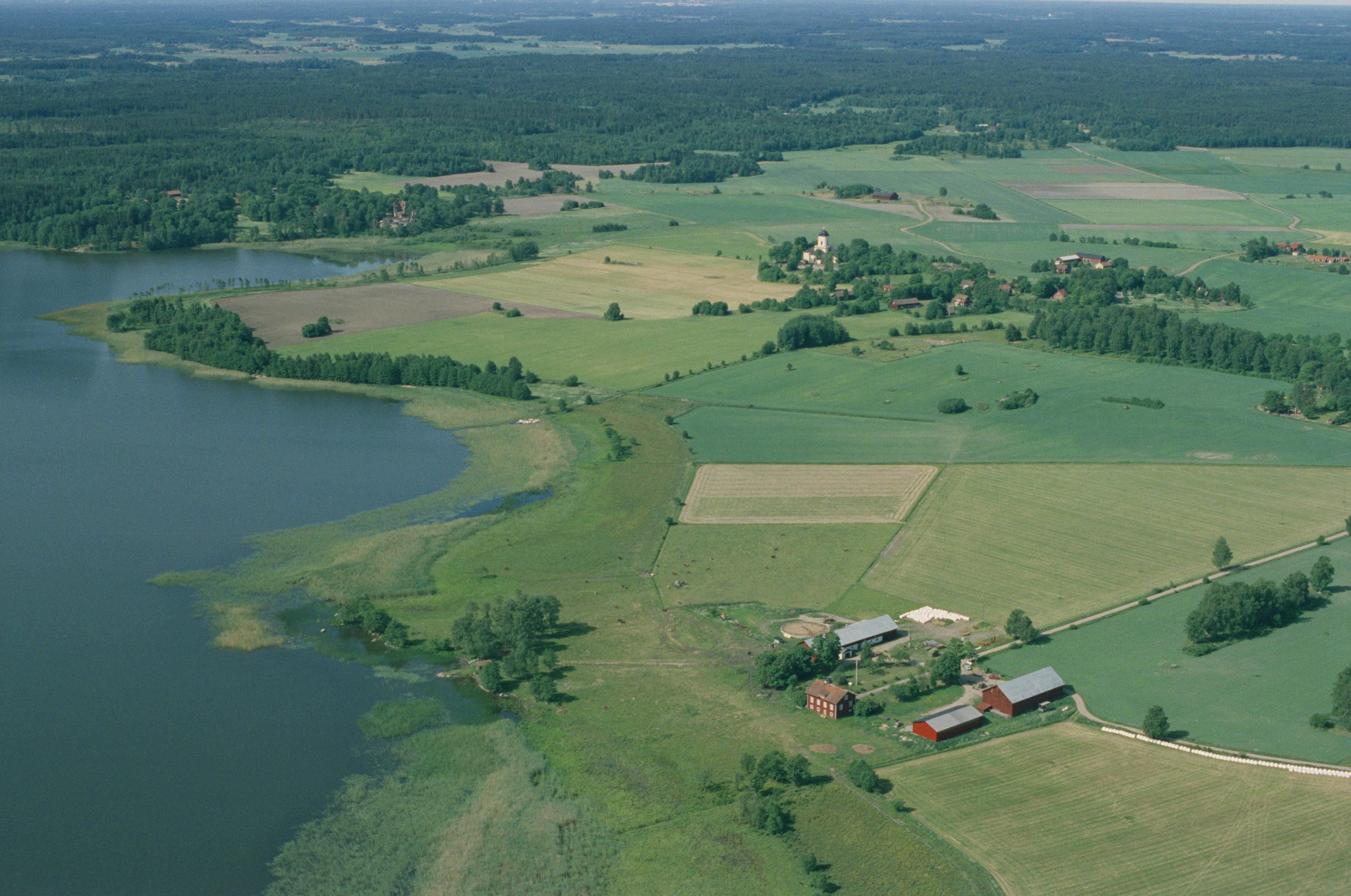 Beskrivning: Under bildens mitt Uggelnäs gård med strandäng vid sjön Skedviken. I bildens övre del (till vänster) Mörby gård och Mörby slottsruin RAÄnr Fasterna 49:1 och Fasterna kyrka. Bilden är tagen mot (väderstreck): VSV