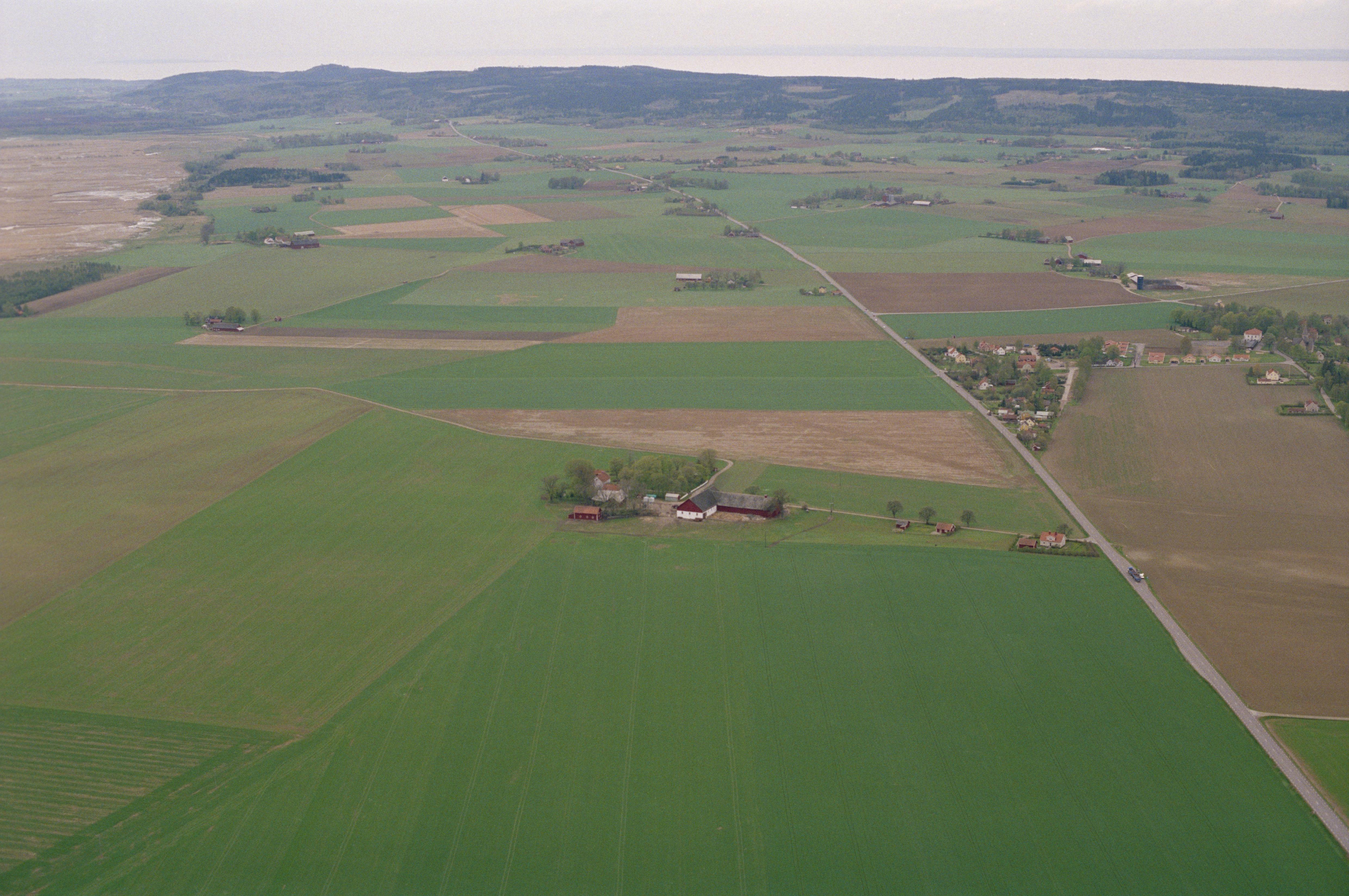 Beskrivning: Bytomt RAÄnr Källstad 25 vid gränsen mellan socknen Källstad (i bildens nedre del) och Rogslösa (i bildens övre del). Rogslösa kyrka och kyrkby uppe till höger. Bilden är tagen mot (väderstreck): SV