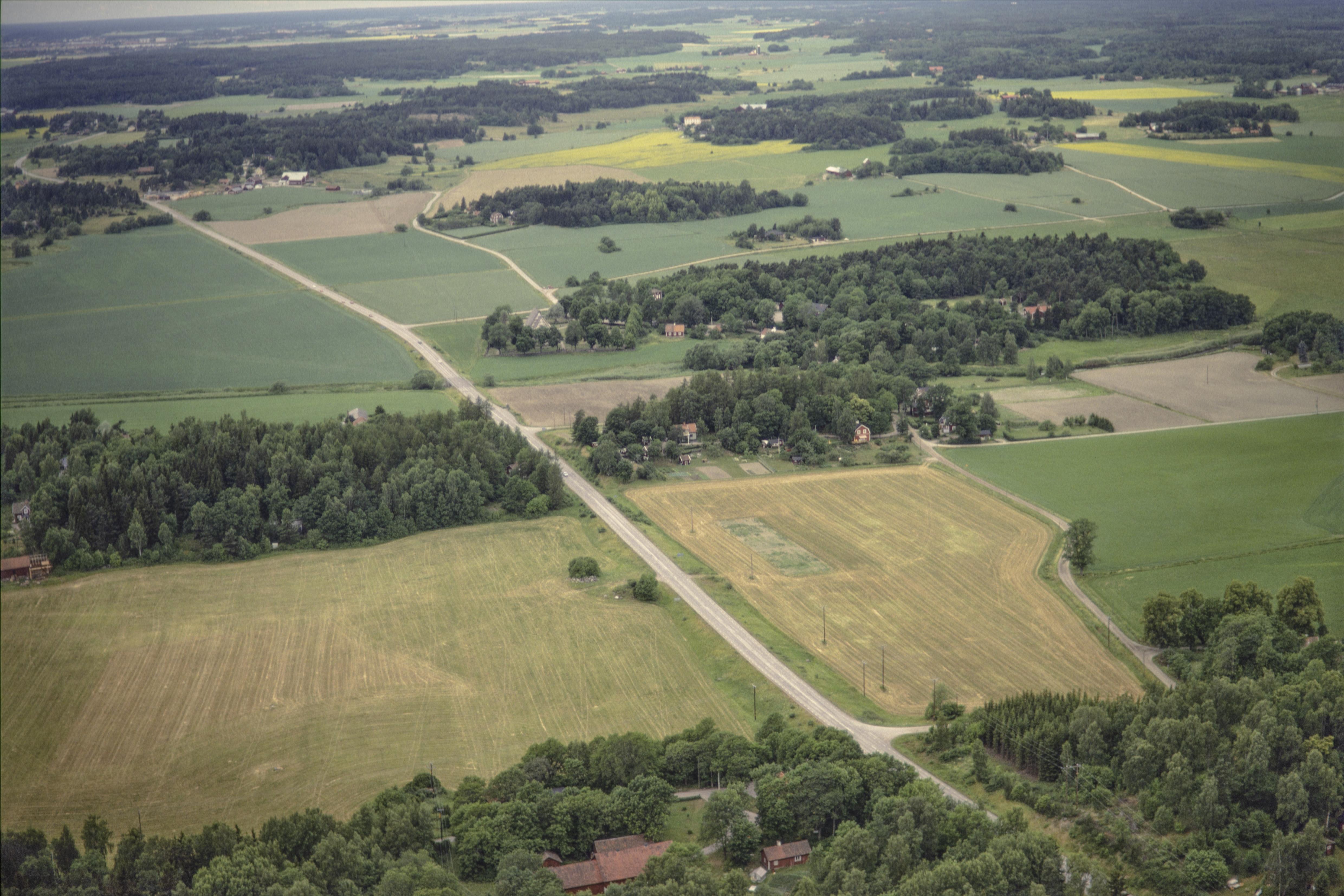 Beskrivning: Vid bildens mitt Funbo kyrka och kyrkby, museijärnväg och åmöte mellan Lillån och Funbyån. Bilden är tagen mot (väderstreck): VNV