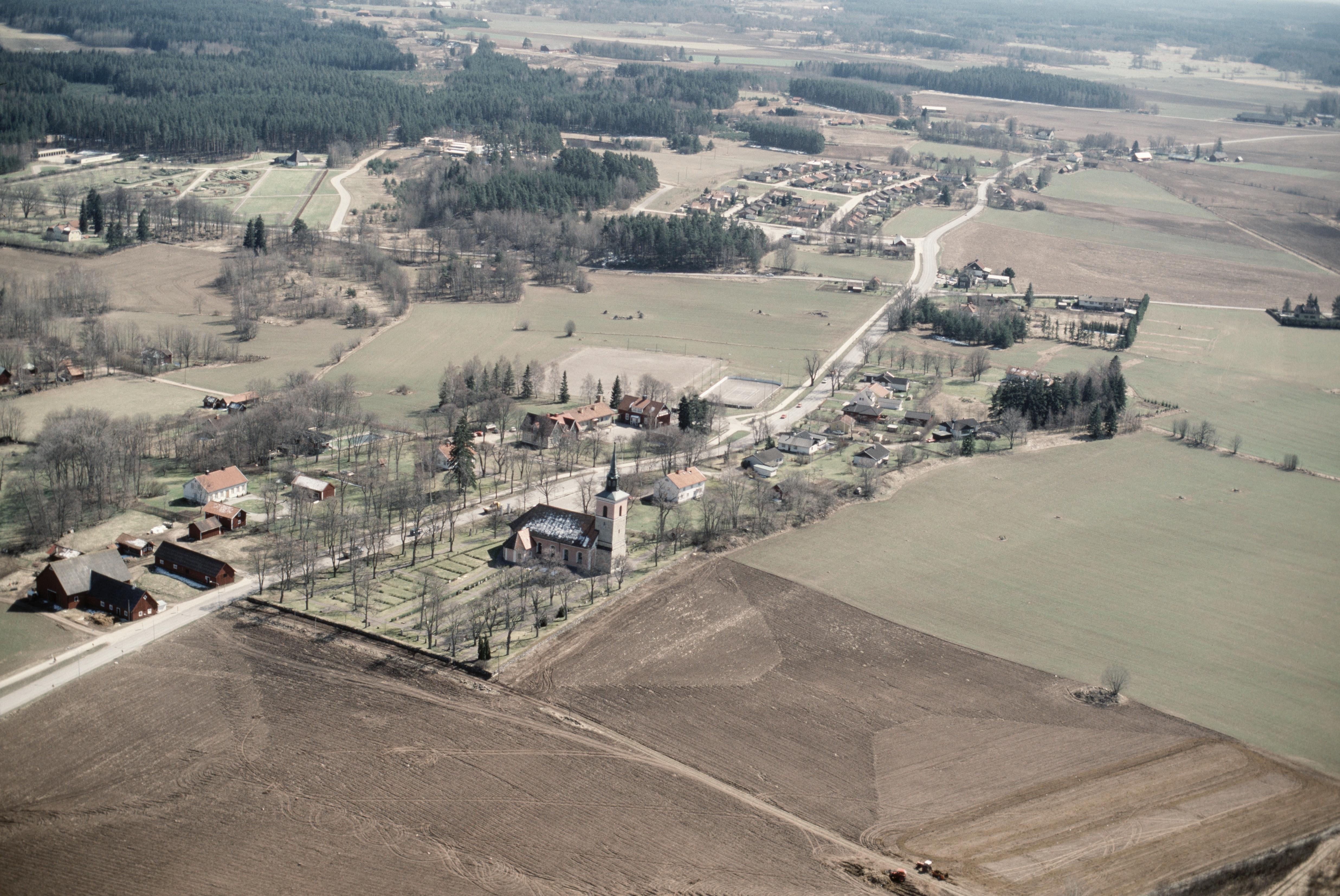 Beskrivning: Slaka kyrka / Sofia Albertina kyrka och kyrkby vid Slakaåsen. Bilden är tagen mot (väderstreck): SSO