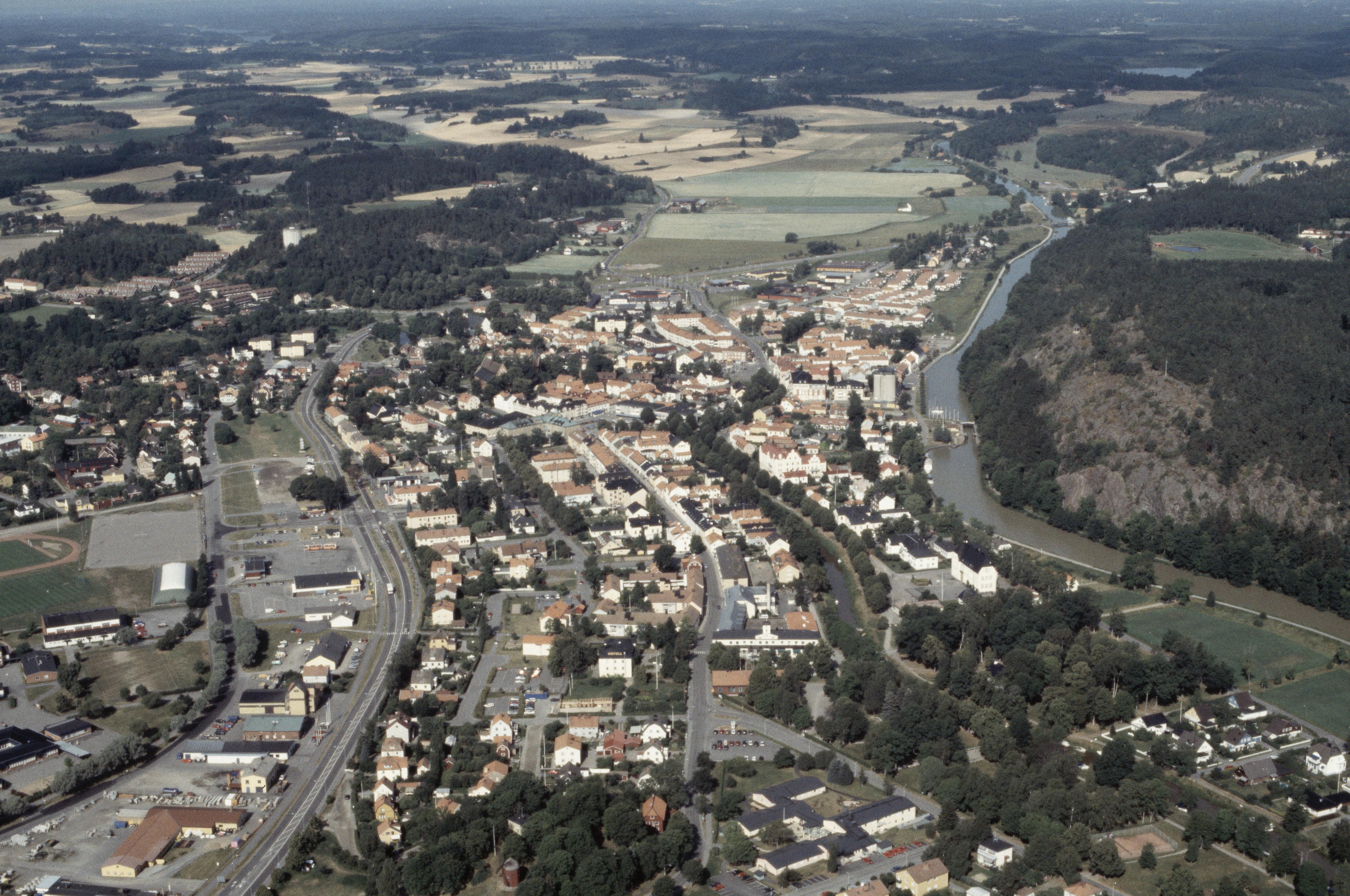 Beskrivning: Storån och Göta kanal (till höger) i Söderköpings stad. Stadslager RAÄnr Söderköping 14:1 till höger om bildens mitt. Ramunderberget i bildens högra kant. Bilden är tagen mot (väderstreck): NV
