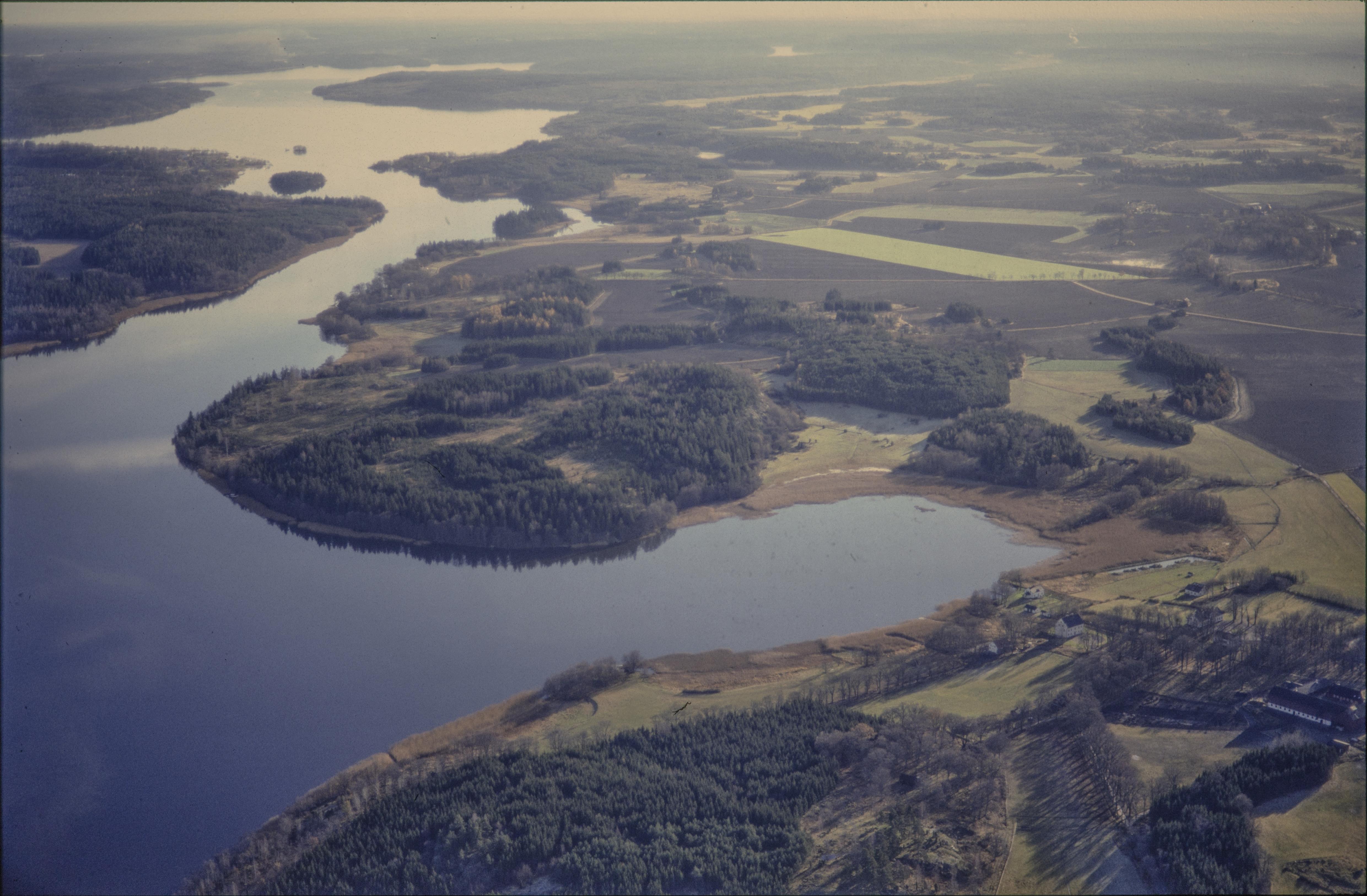 Beskrivning: Håtunaviken i Mälaren. Viken markerar gränsen mellan socknen Håtuna och Sankt Per (till vänster). På udden vid bildens mitt gravfält RAÄnr Håtuna 54:1. nere till höger Håtunaholms herrgård. I bildens övre del Signhildsberg. Bilden är tagen mot (väderstreck): SO