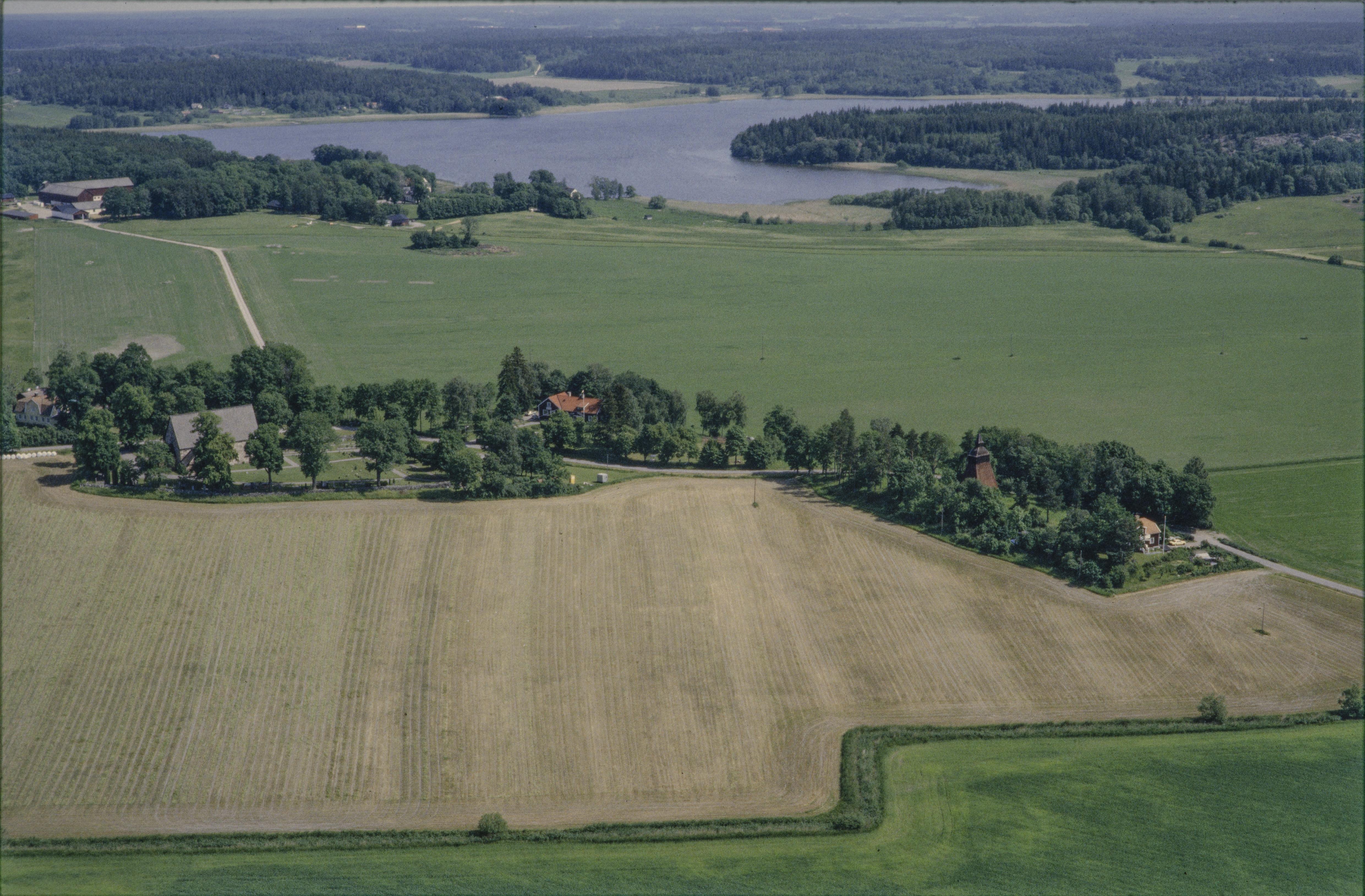 Beskrivning: Håtuna kyrka och kyrkby. Vid bildens mitt Prästgårdens gamla tomt RAÄnr Håtuna 157:1. I bildens övre del Håtunaviken i Mälaren mot socknet Sankt Per. Bilden är tagen mot (väderstreck): NO