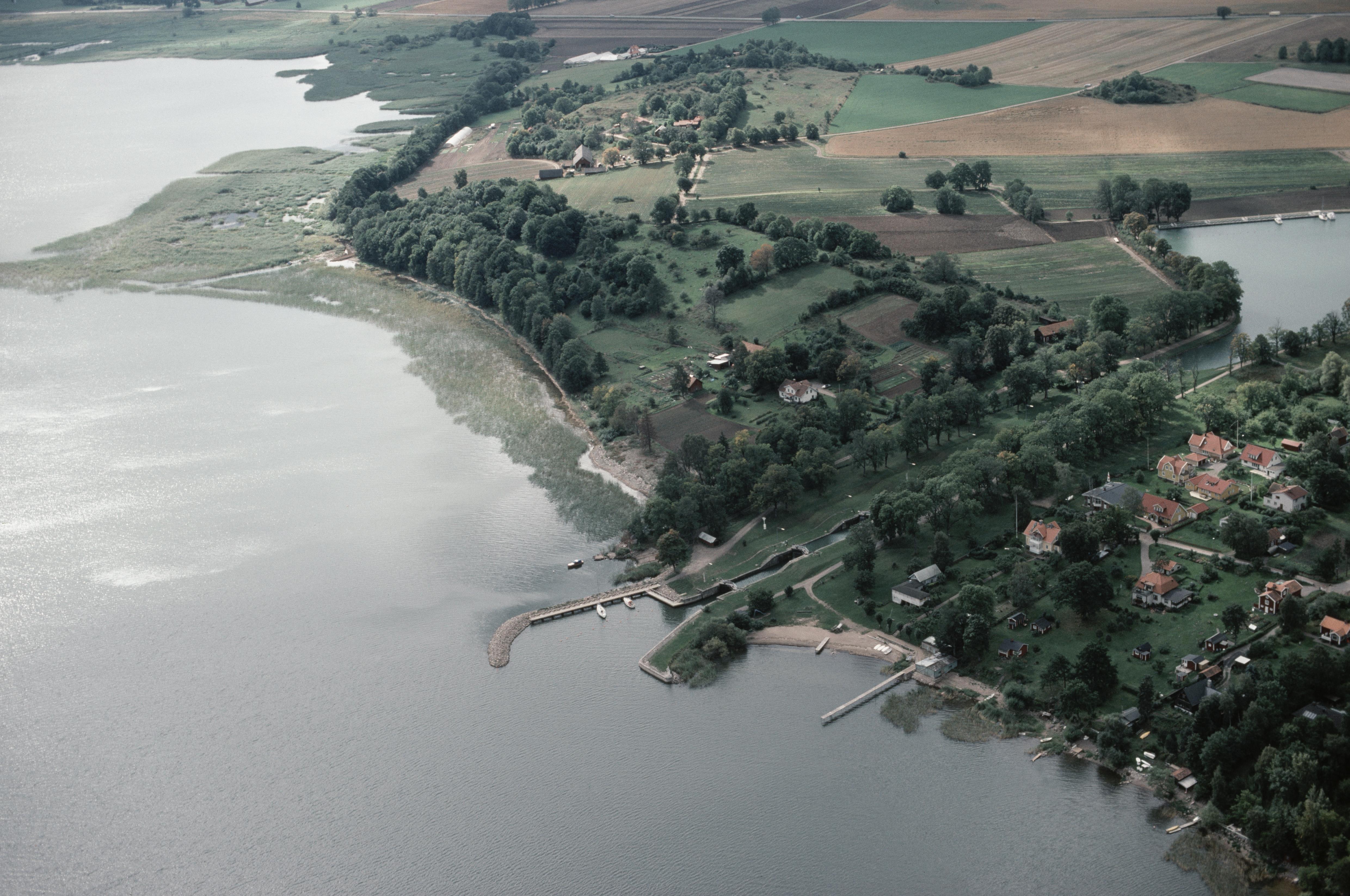 Beskrivning: Göta kanal vid sjön Roxen, Bergs slussar med kanalmärke RAÄnr Vreta kloster 110:1 till höger om bildens mitt. Bilden är tagen mot (väderstreck): SV