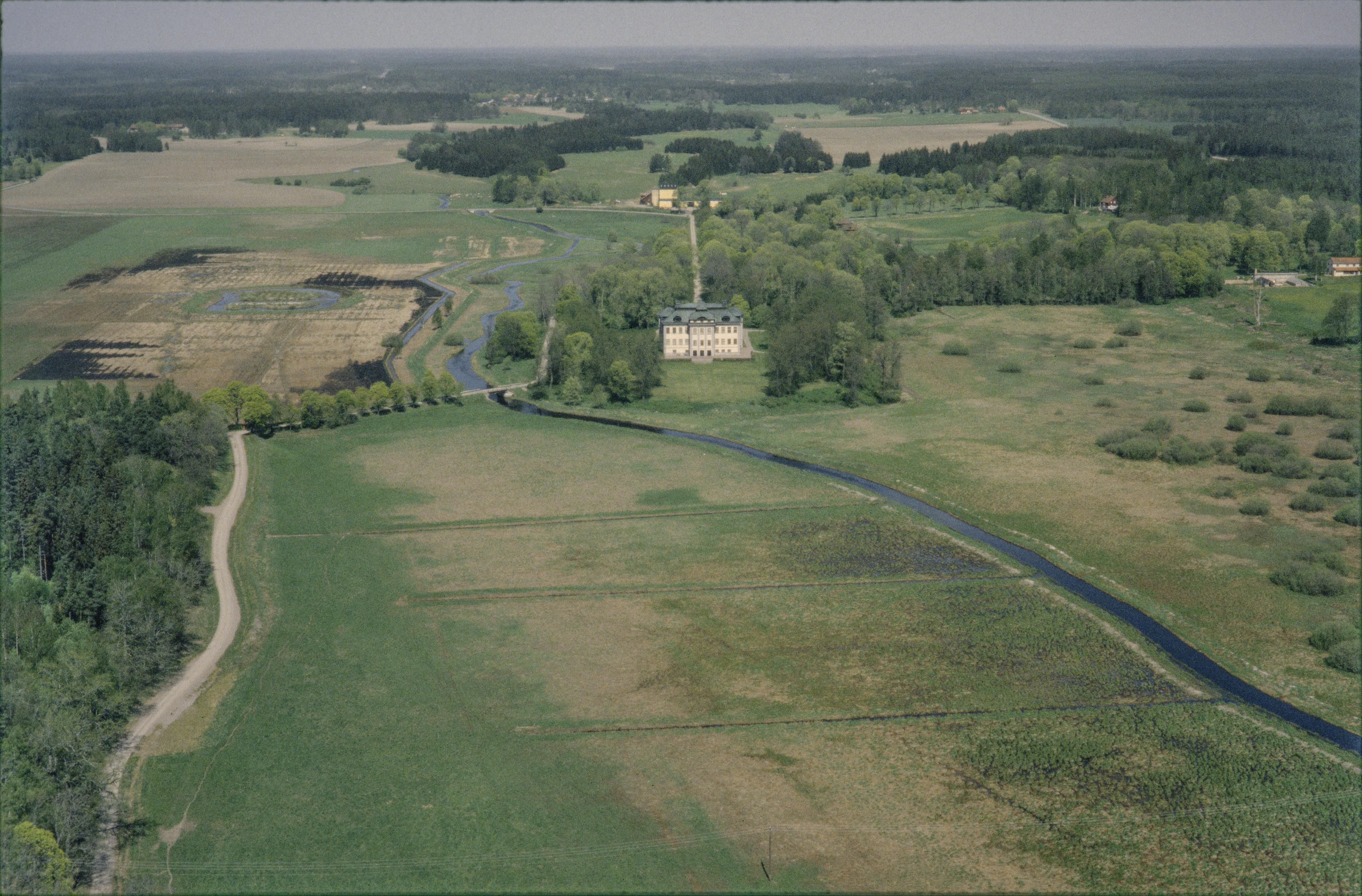 Beskrivning: Salsta slott byggnadsminne RAÄnr Lena 7:1 vid Fyrisån. Tensta socken uppe till vänster. Bilden är tagen mot (väderstreck): N
