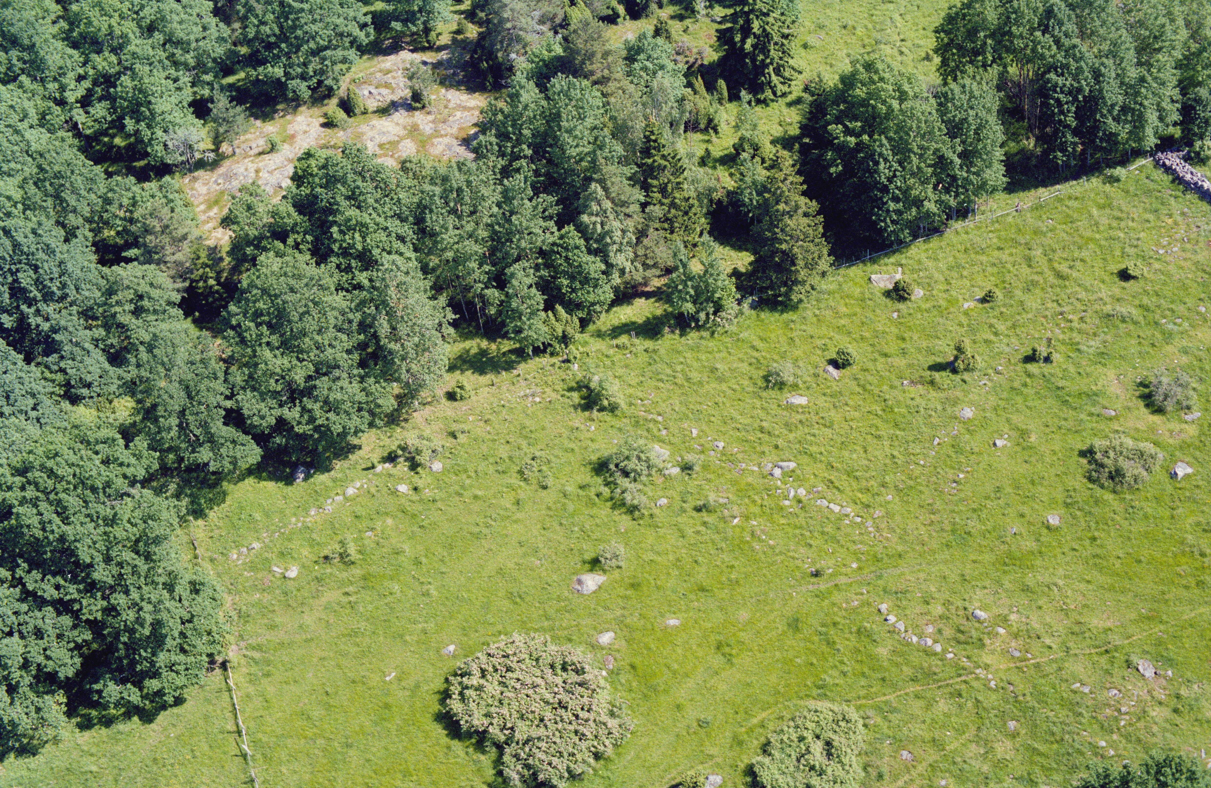 Beskrivning: Innan bygging av väg E4. Precis väster om gårdarna Skarplyckan och Björkslund. Stensträngar RAÄnr Väderstad 144:1 och stensättning Väderstad 142:1. Bilden är tagen mot (väderstreck): NO