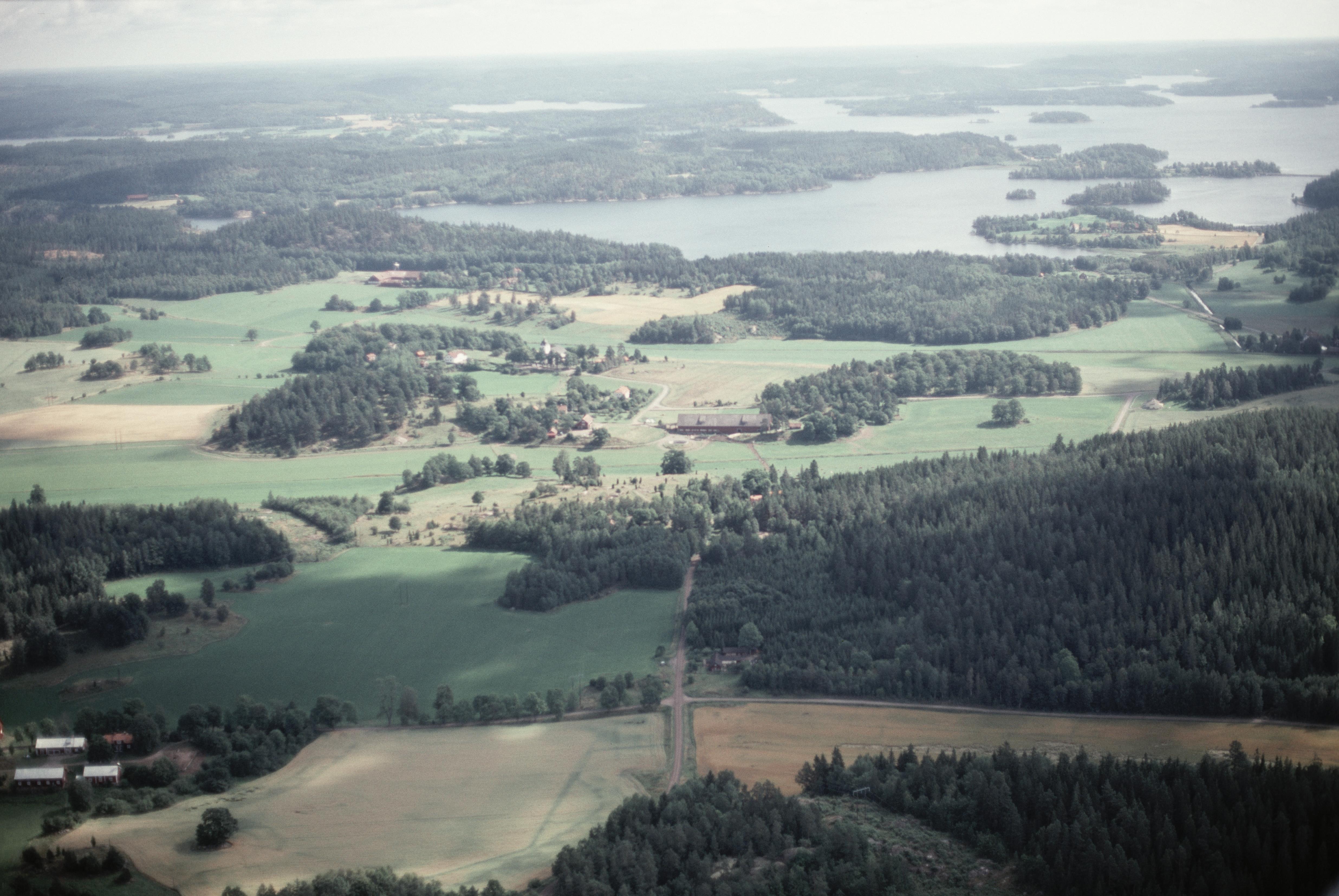 Beskrivning: Nere till vänster Adlerskog. Västra Eneby kyrka till vänster vid bildens mitt. I bildens övre del sjön Åsunden. Bilden är tagen mot (väderstreck): NO