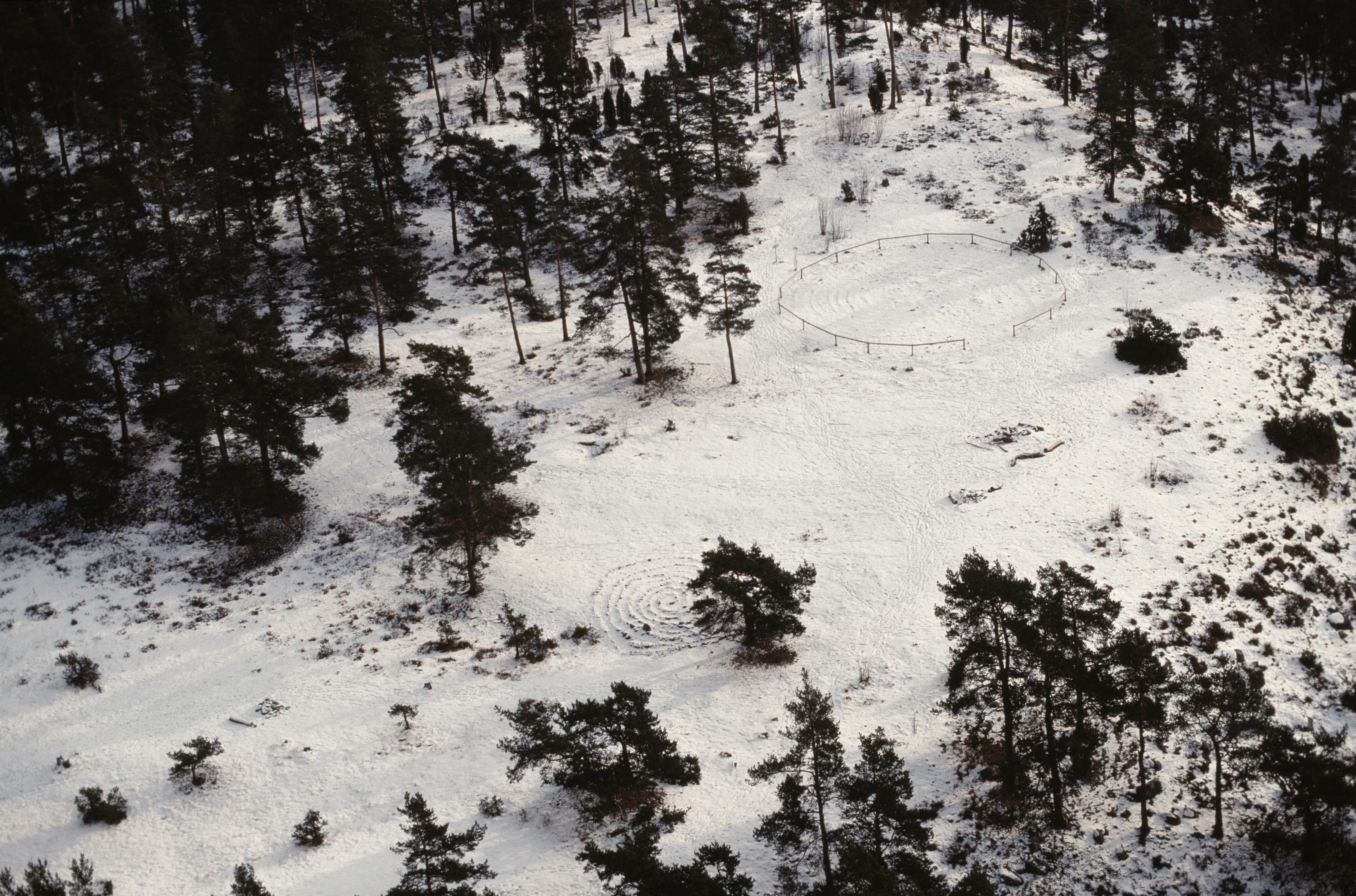 Beskrivning: Rösaringsåsen. Vid bildens mitt en sentida, ny labyrint. Uppe till höger labyrint RAÄnr Låssa 24:1 vid gravfält Låssa 23:1. I bildens övre del södra änden av färdväg (Rösarings processionsväg) RAÄnr Låssa 85:1. Bilden är tagen mot (väderstreck): NO