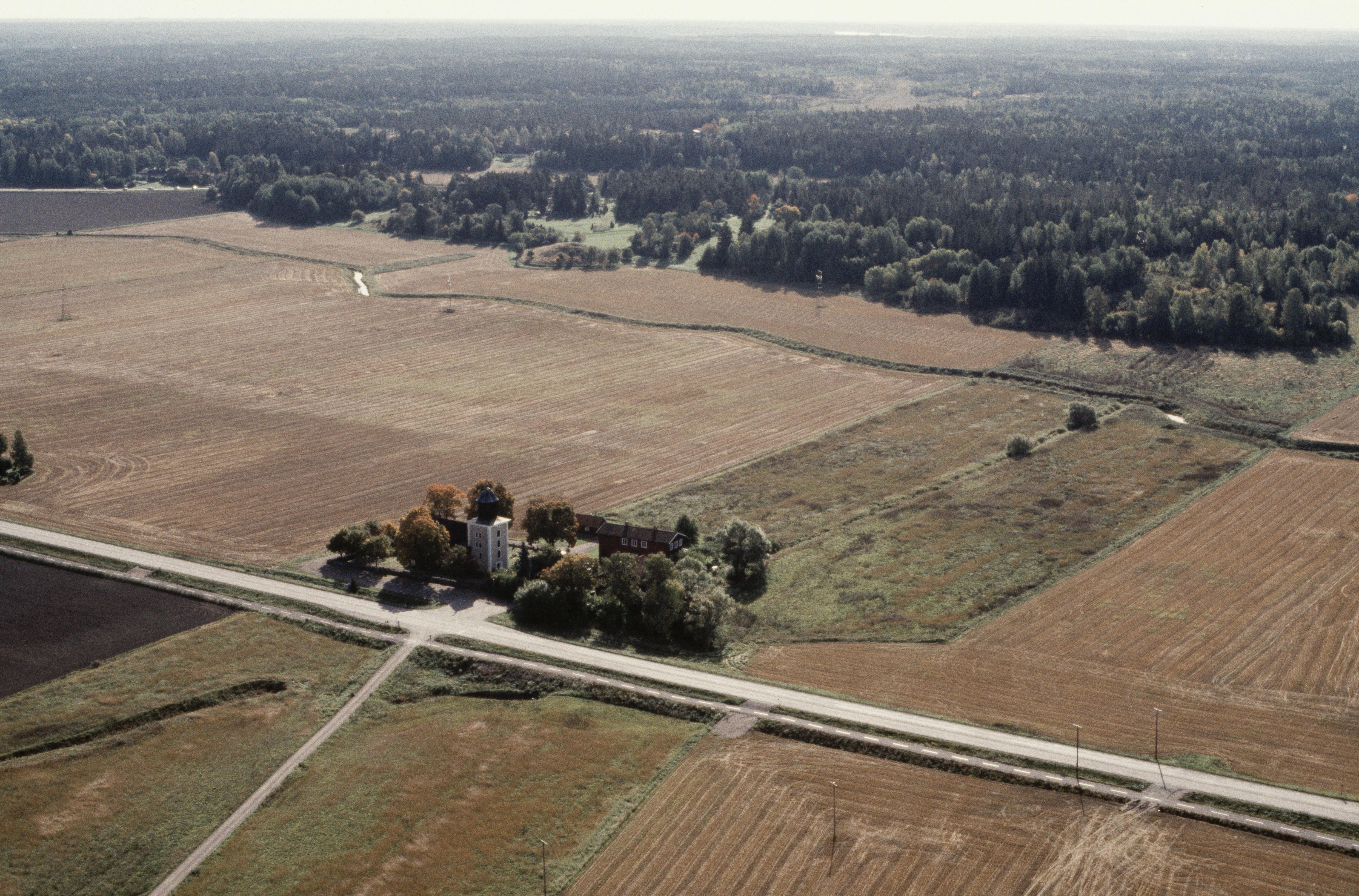 Beskrivning: Hågaåns dalgång vid Läby kyrka och Västerby. Uppe till vänster Vadbackahögen / Läby vad RAÄnr Läby 18:1 och till höger färdväg RAÄnr Läby 20:3. Bilden är tagen mot (väderstreck): SO