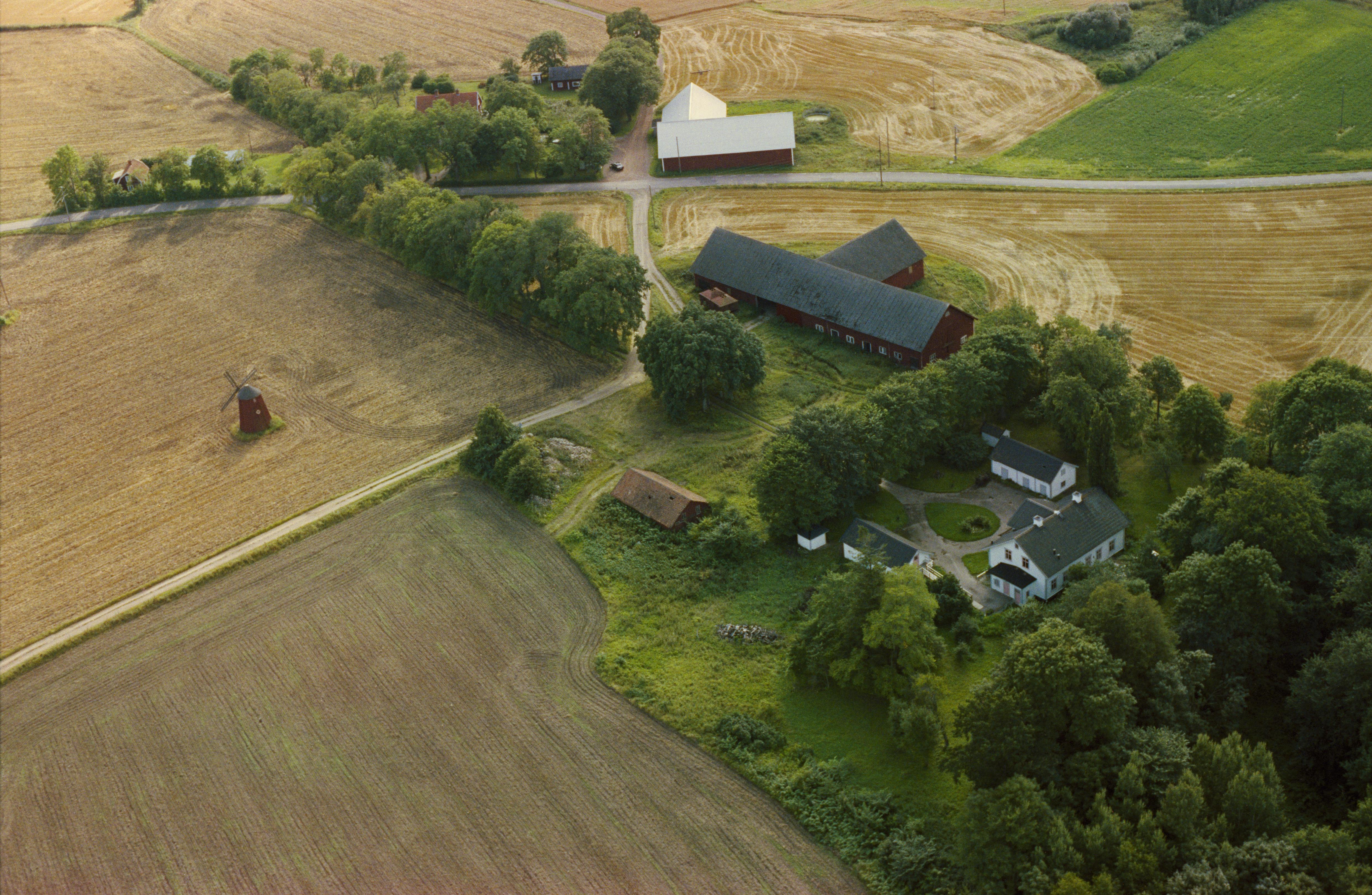 Beskrivning: Stora Broby gård norröst om Alvastra kloster. Boplats RAÄnr Västra Tollstad 22:1 i bildens övre del. Väderkvarn till vänster om bildens mitt. Bilden är tagen mot (väderstreck): SV