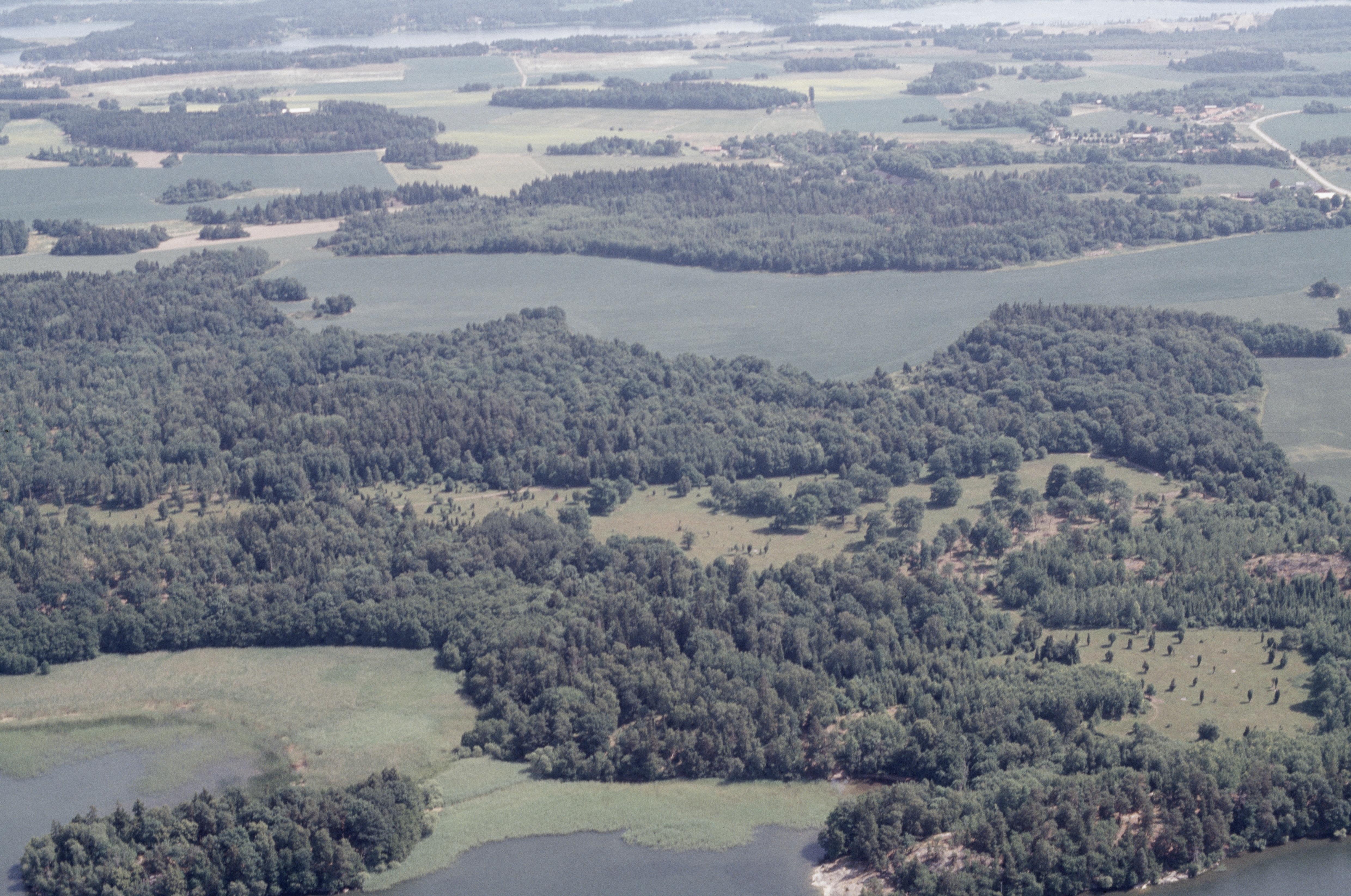 Beskrivning: Munsön vid Svinsundet i Mälaren. I bildens nedre del naturreservatet Väsby hage. Vid bildens mitt fossil åker RAÄnr Munsö 30:1. Bilden är tagen mot (väderstreck): OSO