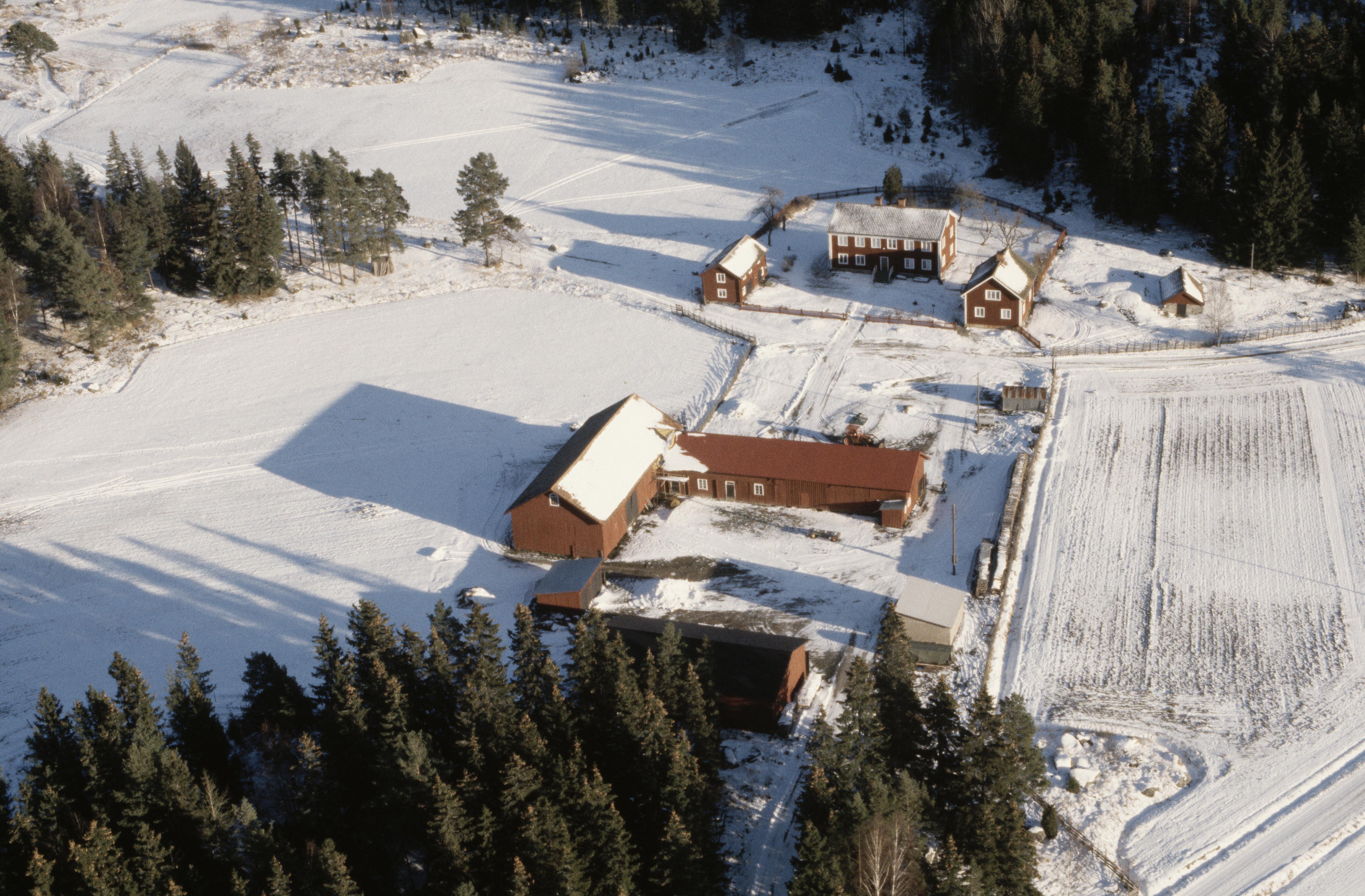 Beskrivning: Gården Kungsgården vid Gunnarsbo. I bildens nedre del kalkugn / kalkugnsruin RAÄnr Norrby 146:1. Bilden är tagen mot (väderstreck): Ö