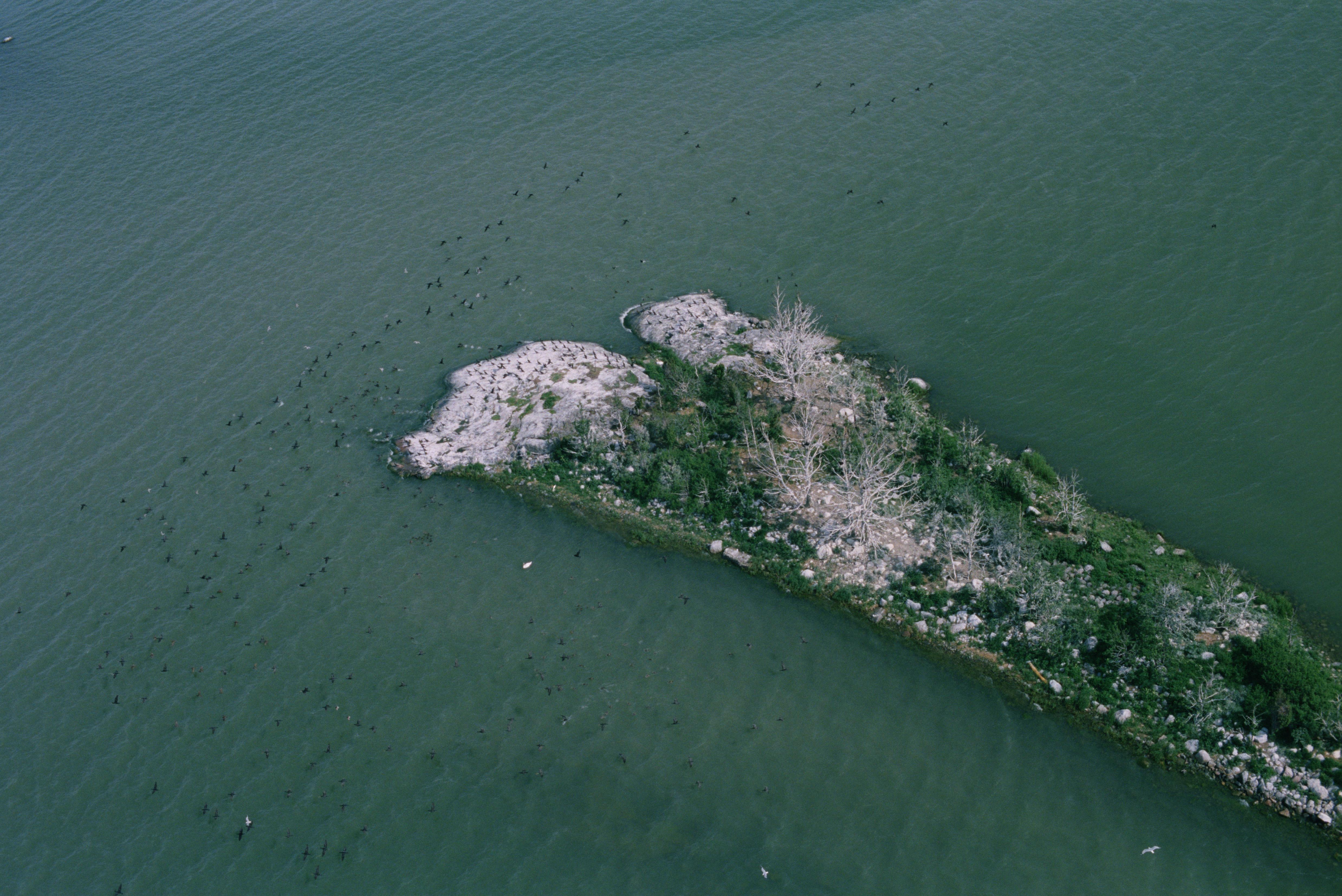 Beskrivning: Havsviken Bråviken. Skarvkoloni (skarv/skarvar/fåglar) på Fågelskär norrost om Ållonö slott RAÄnr Östra Stenby 175:1 i Ållonöfjärden. Bilden är tagen mot (väderstreck): NNO