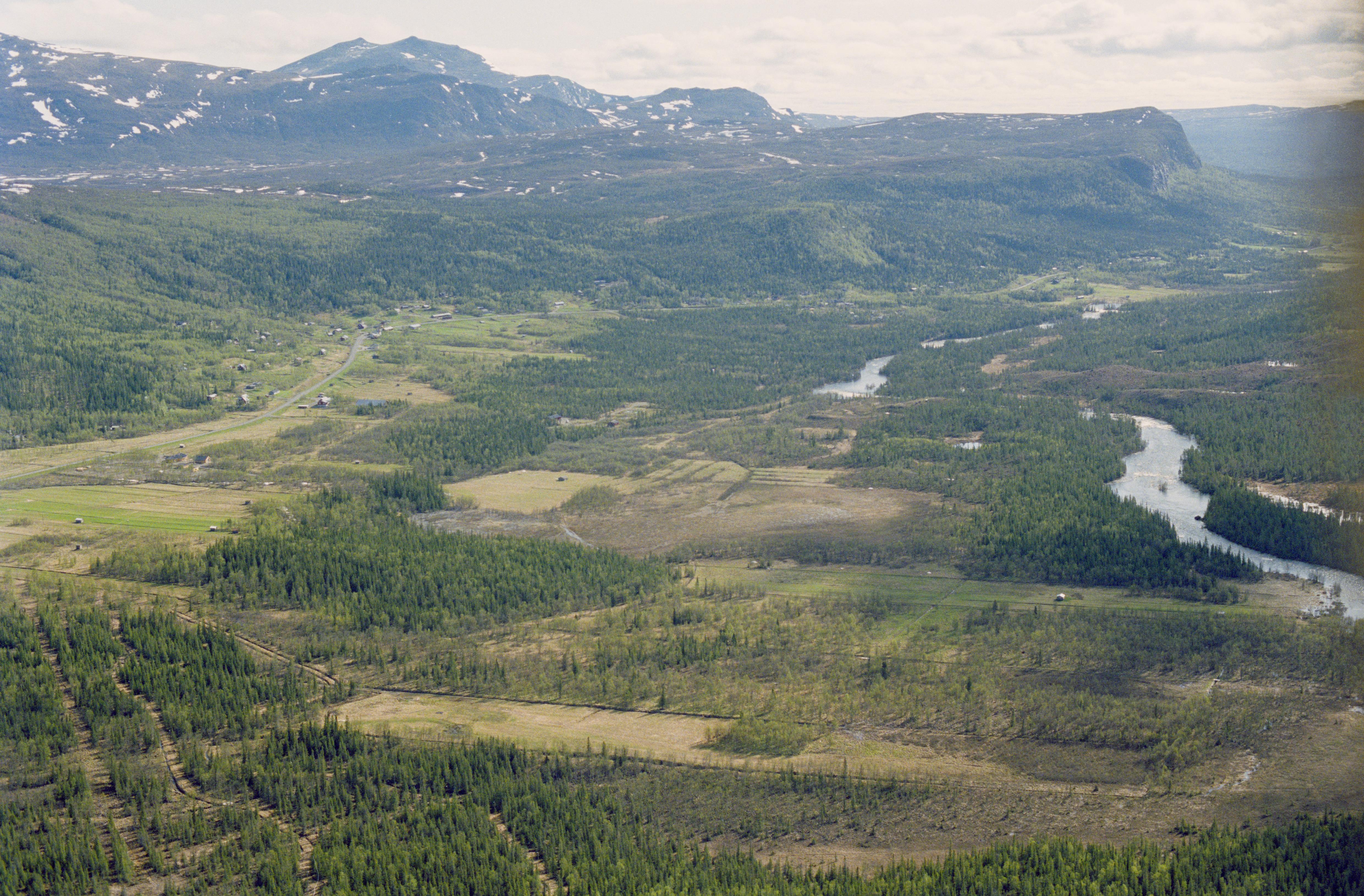 Beskrivning: Orten Kittelfjäll under fjälltopparna Kittelfjället (Stuore Giebnie) och Henriksfjället (Onne Giemnie) i Vojmåns dalgång. Vid ån i bildens mitt flera fyndplats (skärvsten) RAÄnr Vilhelmina 1086:1. Bilden är tagen mot (väderstreck): NO